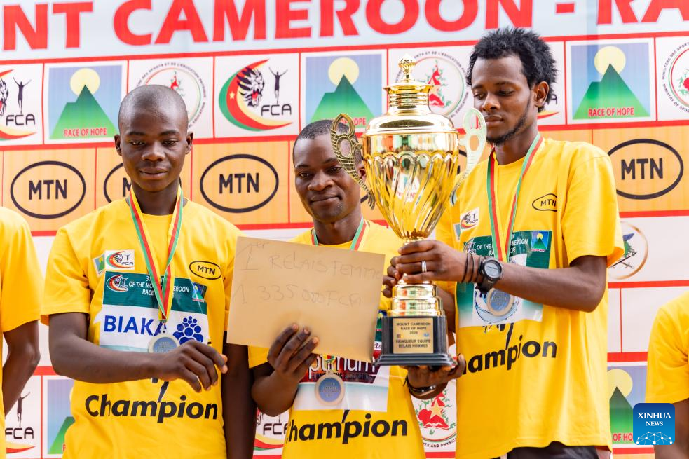 Winners of the relay category pose with their trophy during the awarding ceremony for the 31st edition of the Mount Cameroon Race in Buea, Cameroon, Feb. 21, 2026. The race opened under the theme "Give peace a chance", drawing 600 athletes from 14 countries and regions. (Photo by Muleng Timngum/Xinhua)