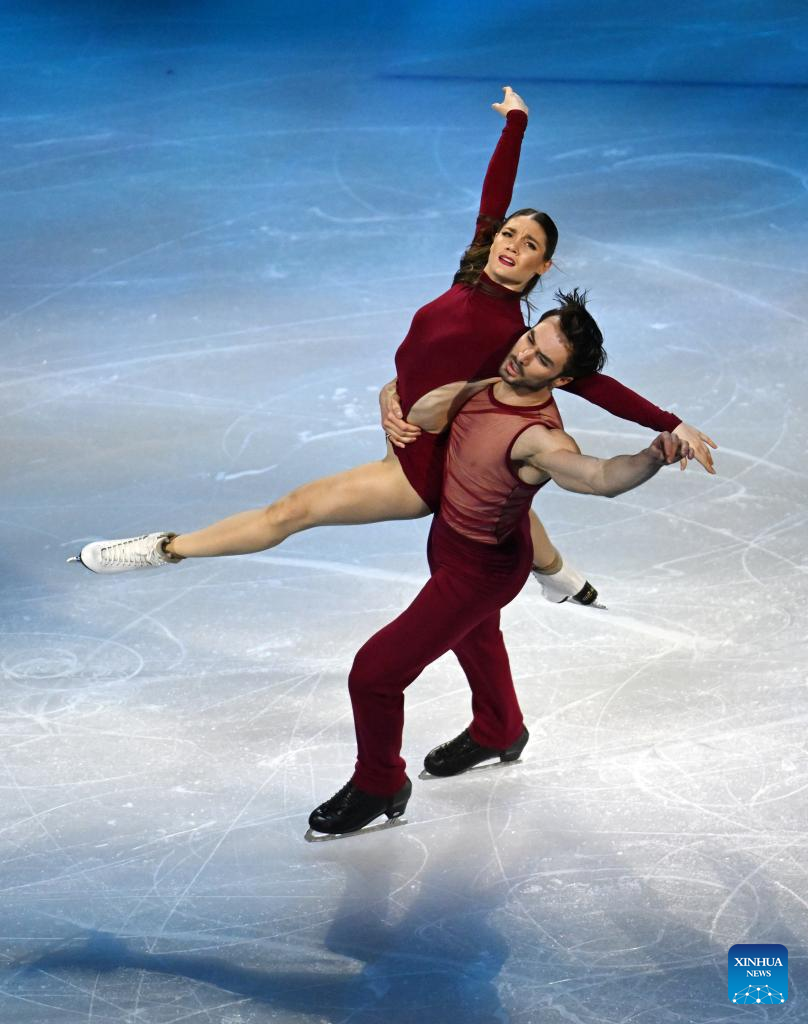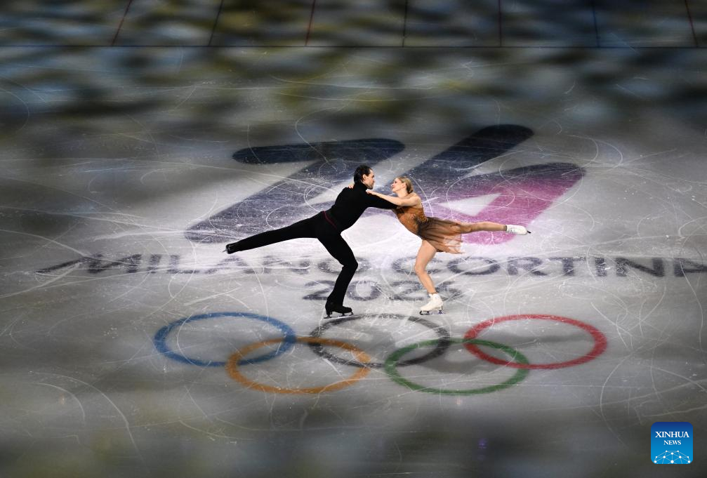 Laurence Fournier Beaudry (L)/Guillaume Cizeron of France perform during the gala exhibition of figure skating at the Milan-Cortina 2026 Olympic Winter Games in Milan, Italy, Feb. 21, 2026. (Xinhua/Cheng Min)