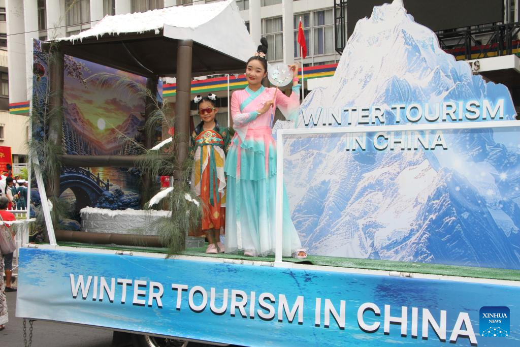This photo taken on Feb. 28, 2026 shows a float themed on China's winter tourism during a float parade marking the Spring Festival in Port Louis, Mauritius. The parade, jointly organized by the Chinese Embassy in Mauritius, the China Cultural Center in Mauritius, the Municipality of Port Louis and the United Chinese Associations, was held in a festive and sharing atmosphere in Port Louis on Saturday. (Photo by Ally Soobye/Xinhua)