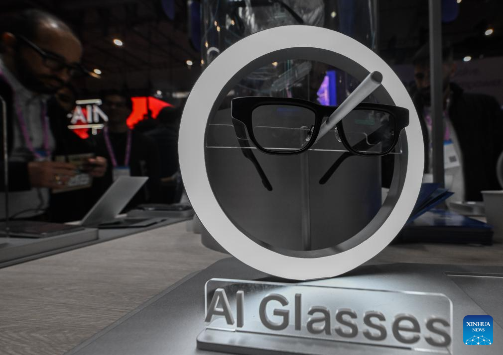 A pair of AI glasses from China's iFLYTEK is on display during the 2026 Mobile World Congress (MWC) in Barcelona, Spain, March 5, 2026. The 2026 MWC concluded here on Thursday. (Xinhua/Cheng Min)