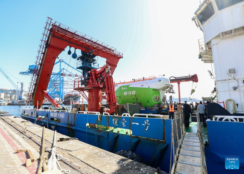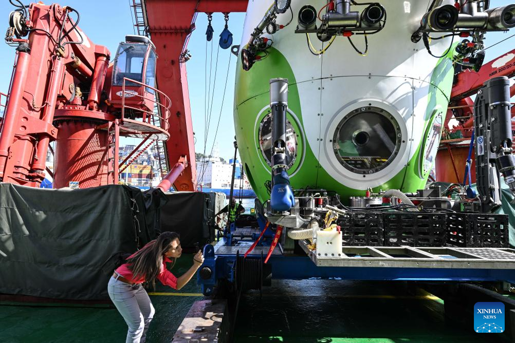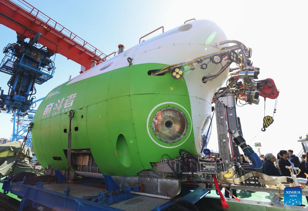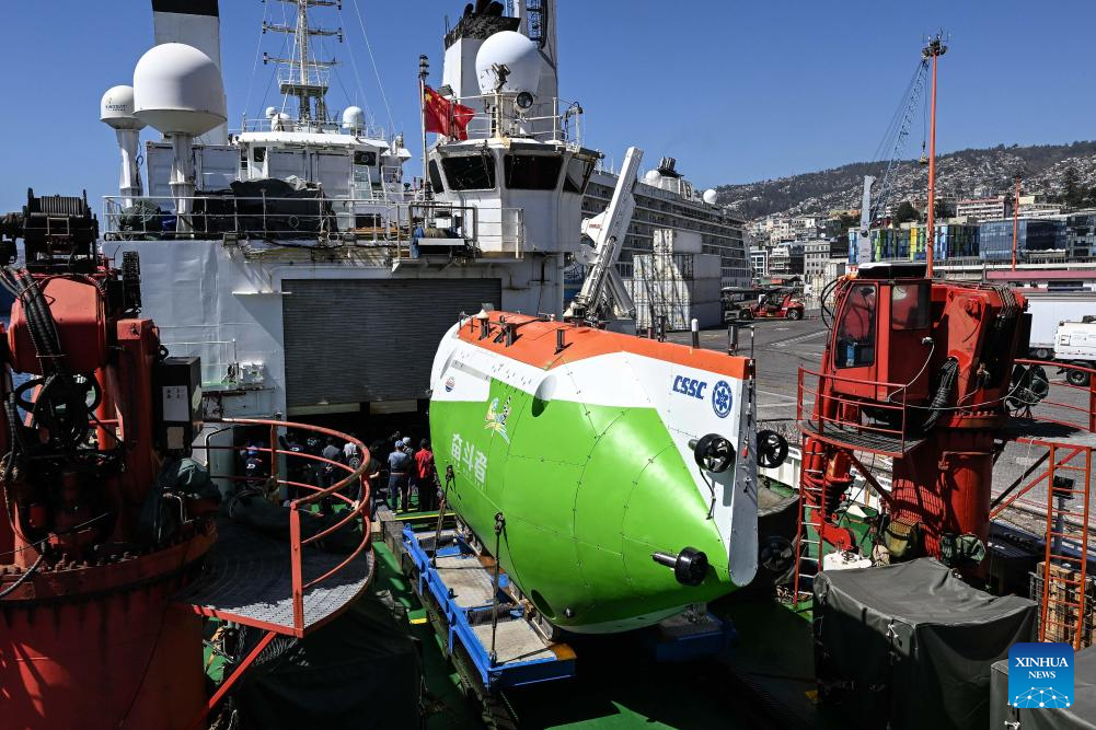 This photo taken on March 5, 2026 shows the deep-sea manned submersible Fendouzhe onbroad the research ship Tansuo-1 at the port of Valparaiso, Chile. The closing reception of the Joint China-Chile Atacama Trench Expedition was held here on Thursday. (Xinhua/Zhou Jiayi)
