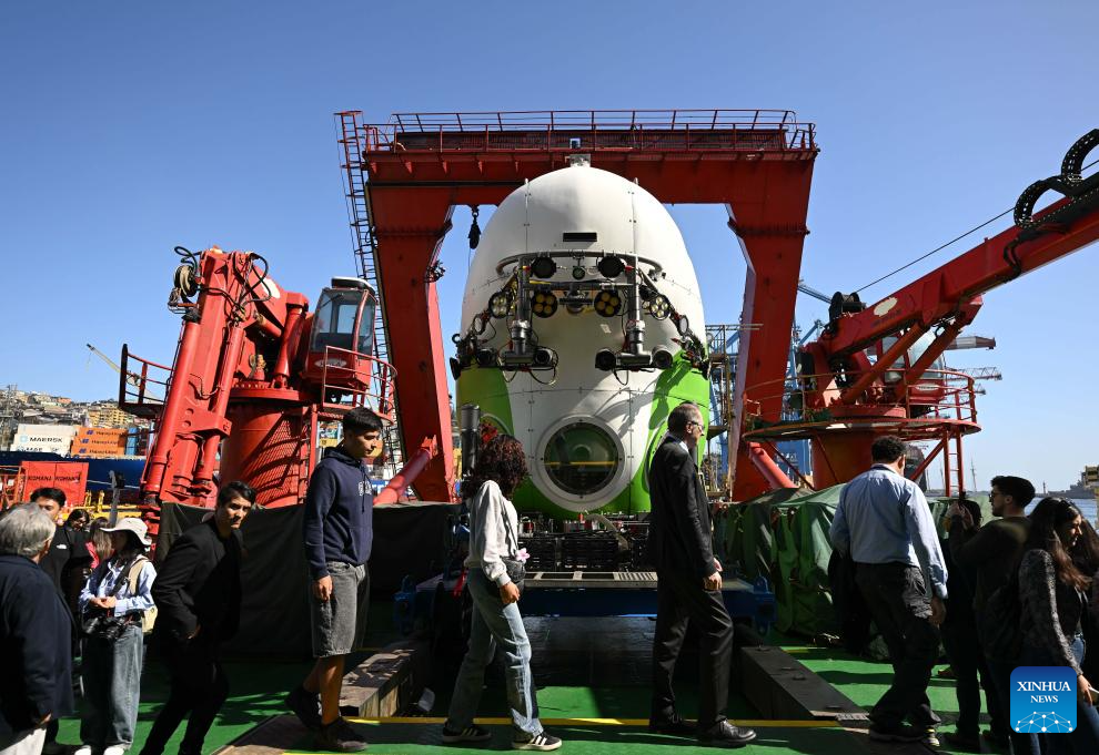People look at the deep-sea manned submersible Fendouzhe onbroad the research ship Tansuo-1 at the port of Valparaiso, Chile, March 5, 2026. The closing reception of the Joint China-Chile Atacama Trench Expedition was held here on Thursday. (Xinhua/Zhou Jiayi)