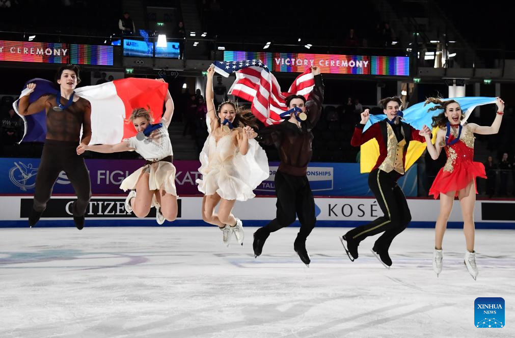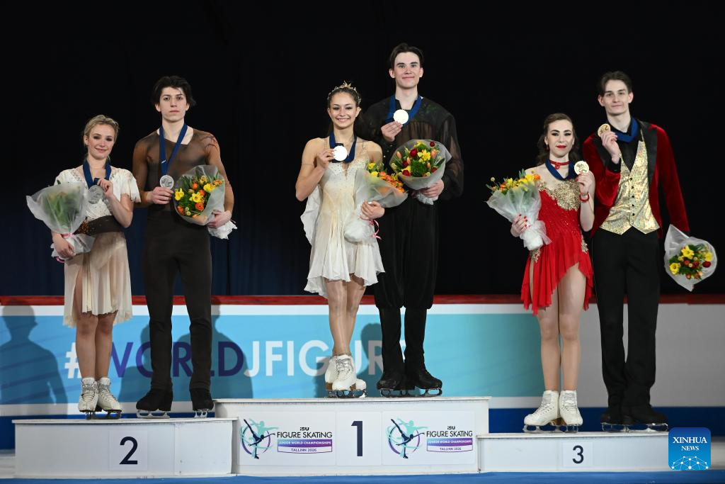 Medalists pose for photos during the award ceremony for the free dance of Ice Dance at ISU Figure Skating Junior World Championships in Tallinn, Estonia, March 7, 2026. (Photo by Sergei Stepanov/Xinhua)