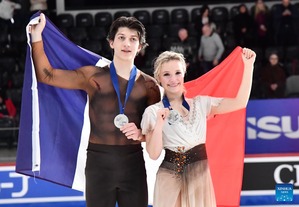 Silver medalists Ambre Perrier Gianesini (R)/Samuel Blanc Klaperman of France pose for photos during the award ceremony for the free dance of Ice Dance at ISU Figure Skating Junior World Championships in Tallinn, Estonia, March 7, 2026. (Photo by Sergei Stepanov/Xinhua)