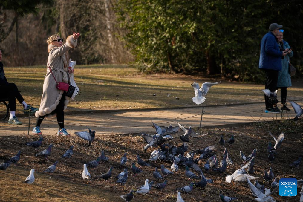A tourist feeds pigeons at the Lazienki Park in Warsaw, Poland, on March 10, 2026. (Photo by Jaap Arriens/Xinhua)
