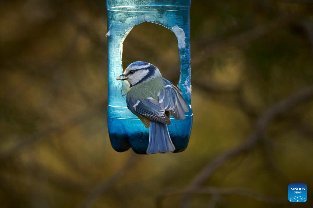 This photo taken on March 10, 2026 shows a blue tit feeding at a bird feeder at the Lazienki Park in Warsaw, Poland. (Photo by Jaap Arriens/Xinhua)