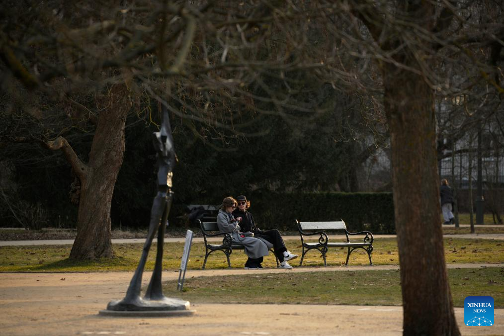 People relax on a bench at the Lazienki Park in Warsaw, Poland on March 10, 2026. (Photo by Jaap Arriens/Xinhua)