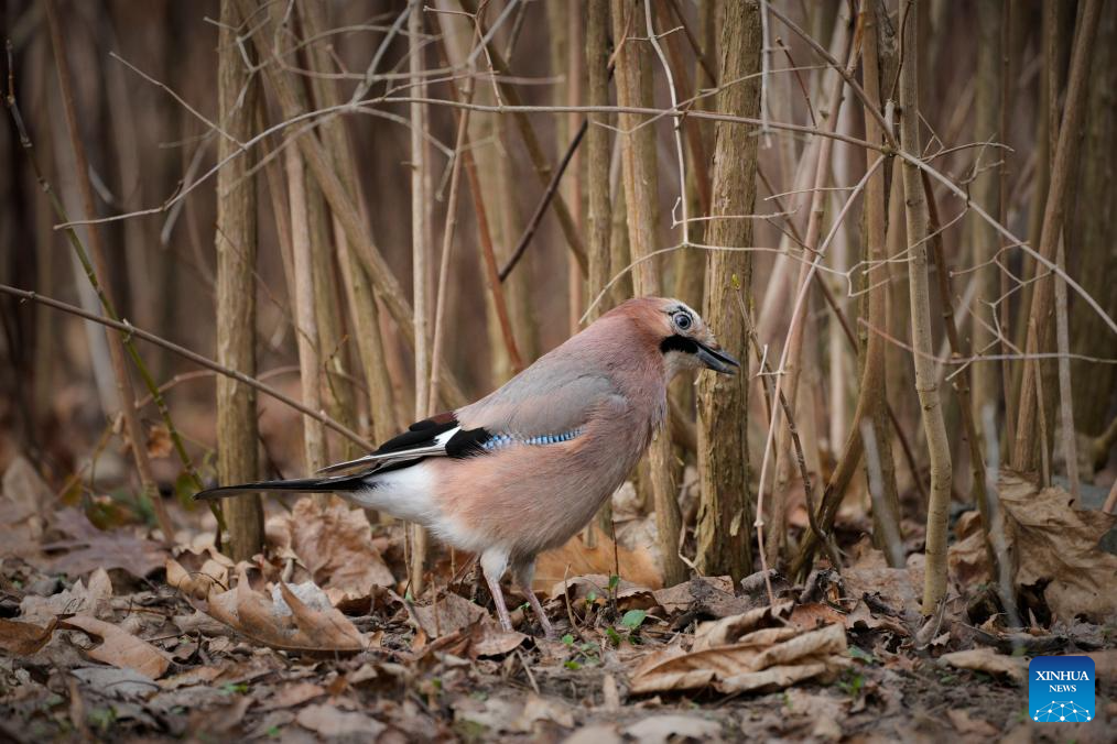 This photo taken on March 10, 2026 shows a Eurasian jay foraging at the Lazienki Park in Warsaw, Poland. (Photo by Jaap Arriens/Xinhua)