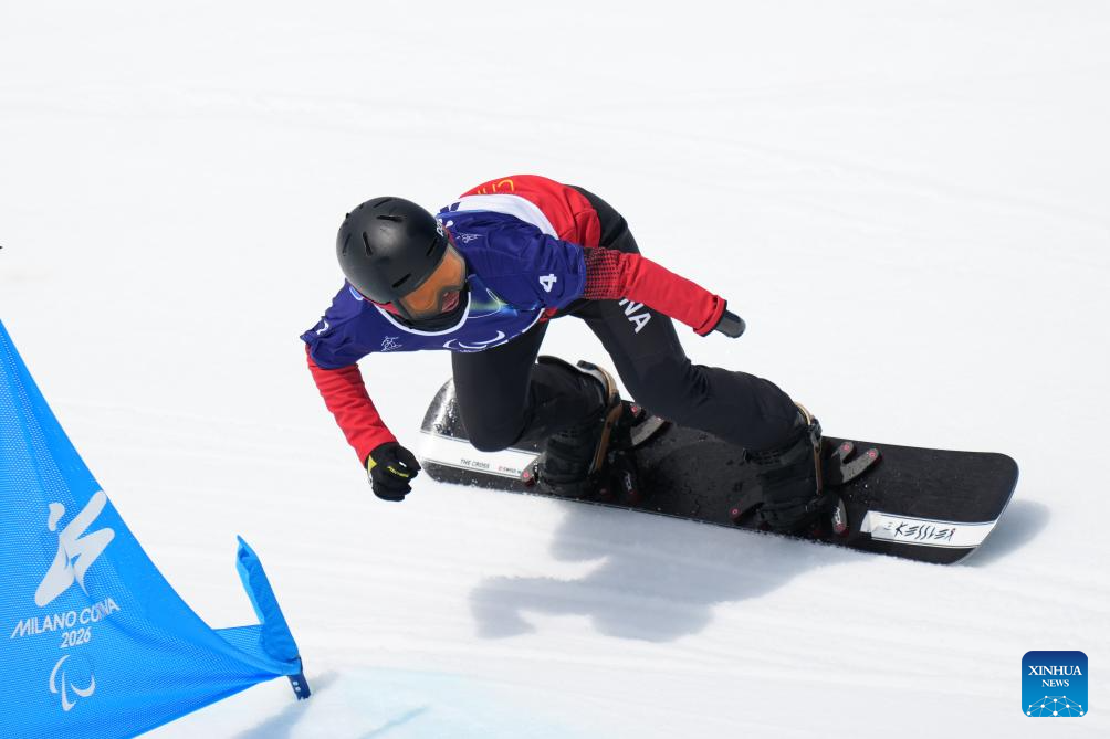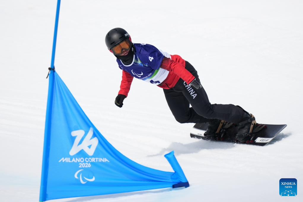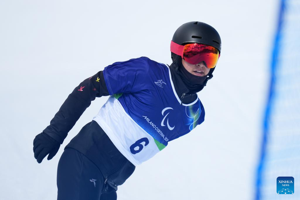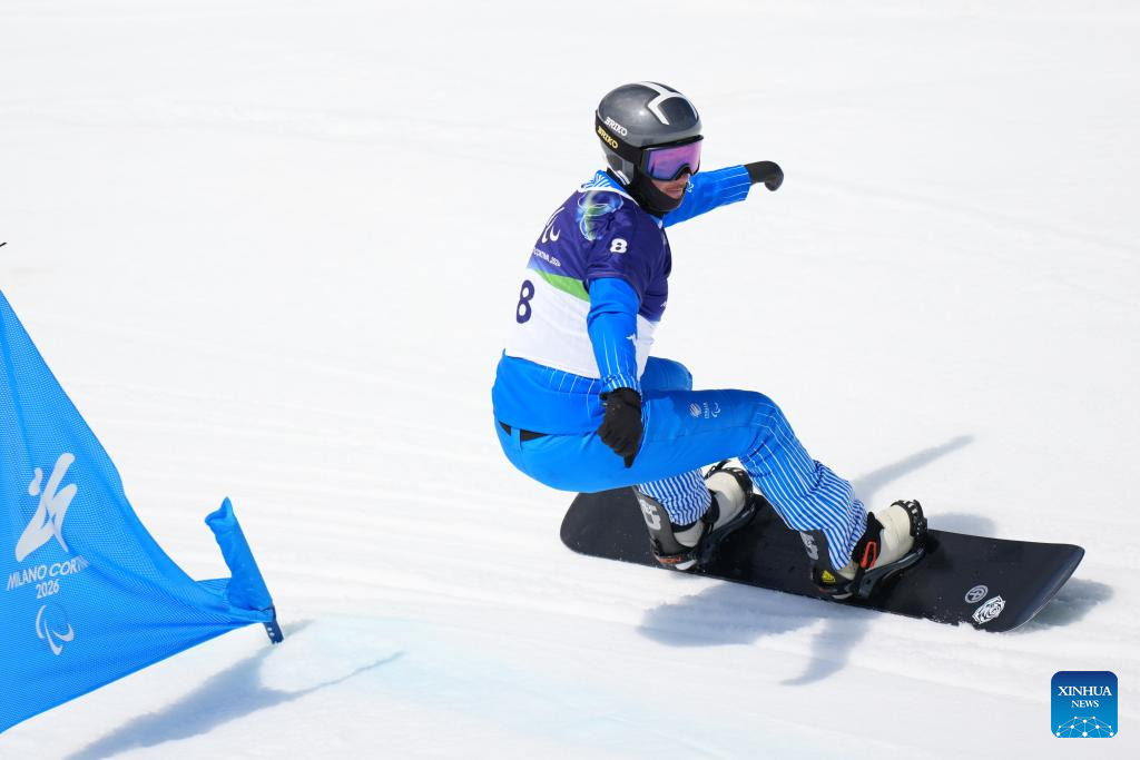 Wang Pengyao of China competes during the Para Snowboard Men's Banked Slalom SB-UL event at the Milan-Cortina 2026 Paralympic Winter Games in Cortina D'ampezzo, Italy, March 13, 2026. (Xinhua/Lian Yi)