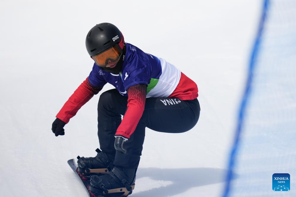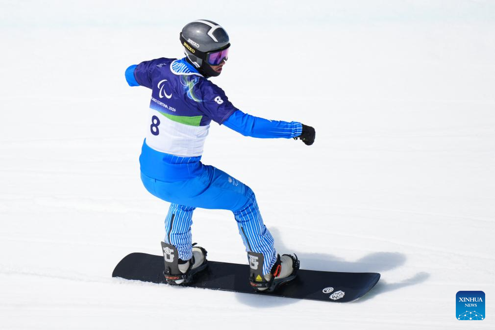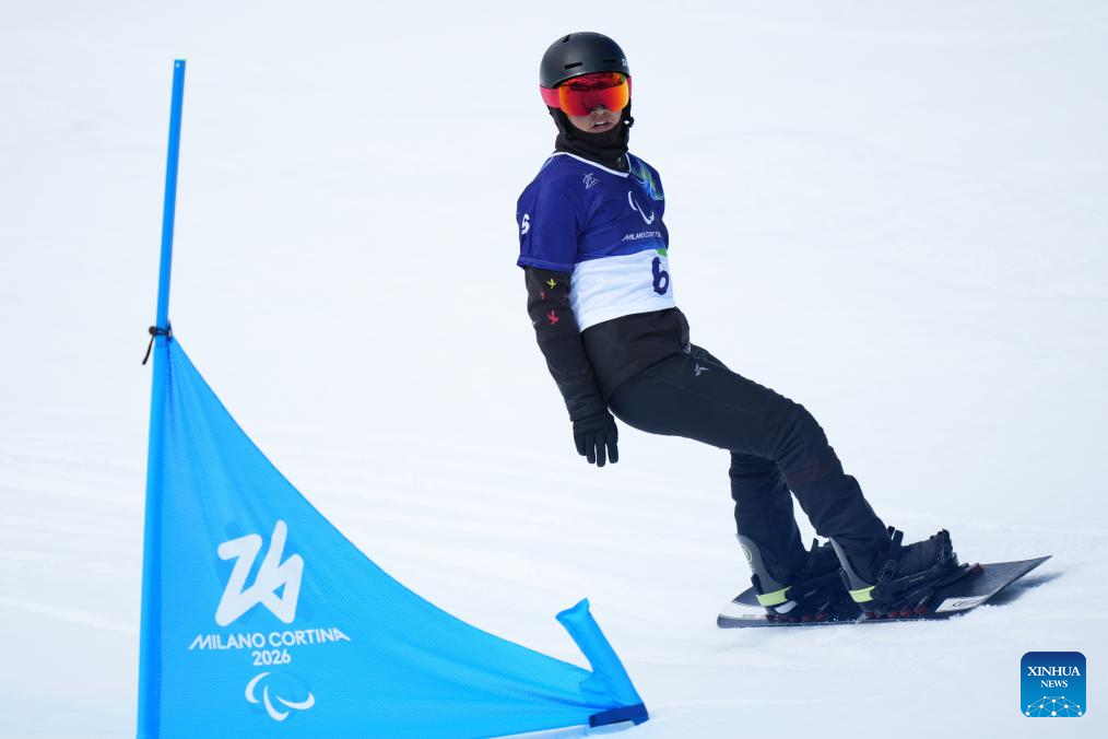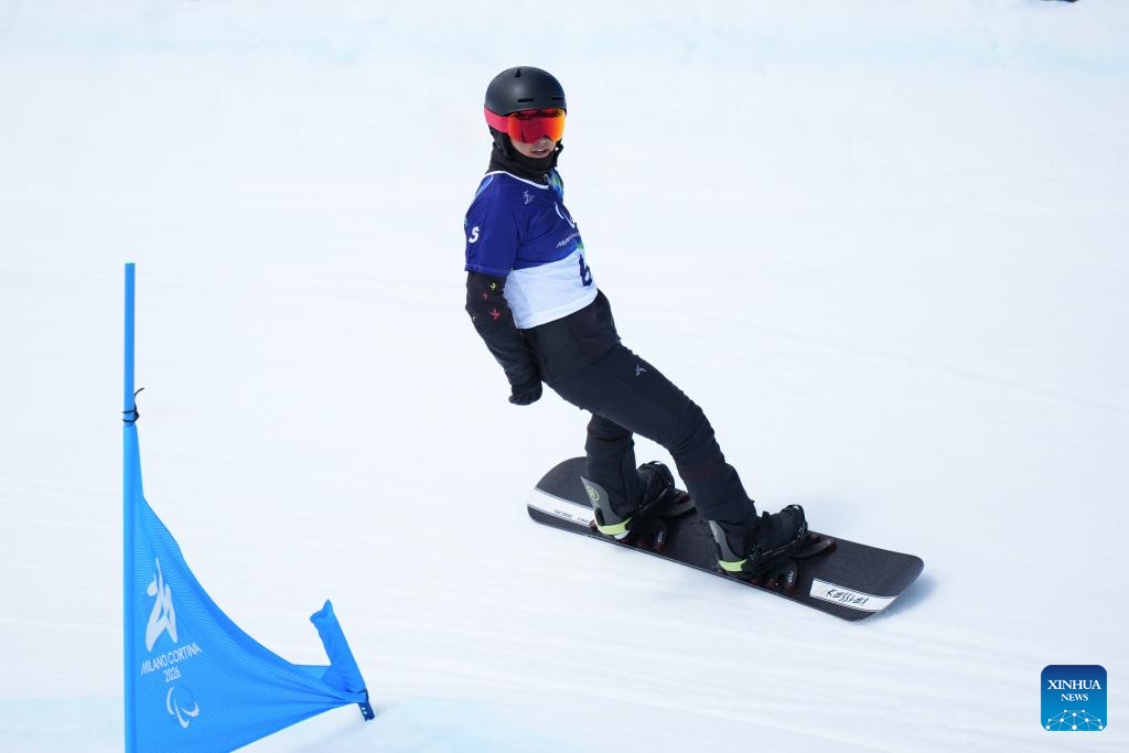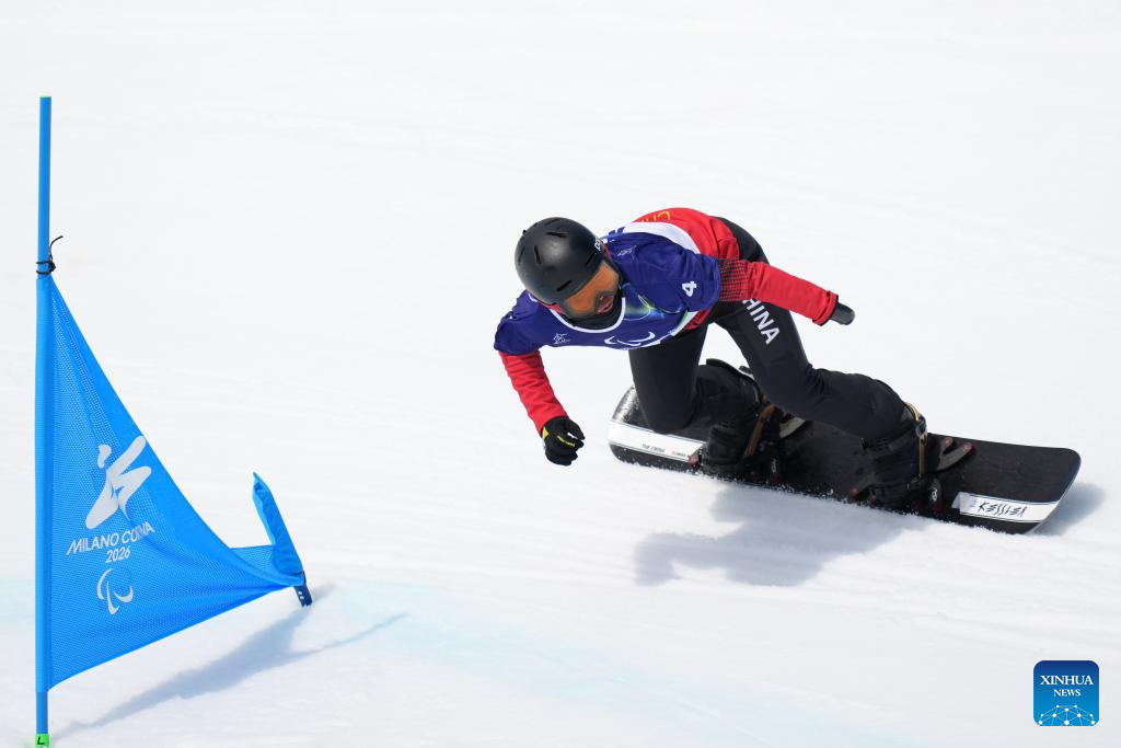 Wang Pengyao of China competes during the Para Snowboard Men's Banked Slalom SB-UL event at the Milan-Cortina 2026 Paralympic Winter Games in Cortina D'ampezzo, Italy, March 13, 2026. (Xinhua/Lian Yi)
