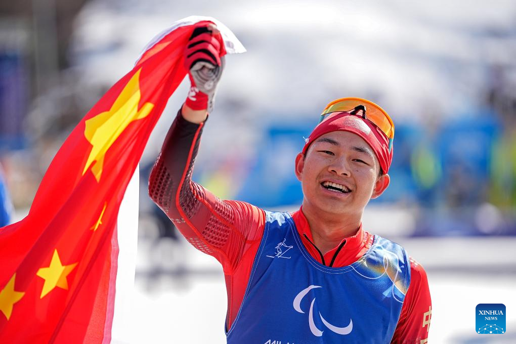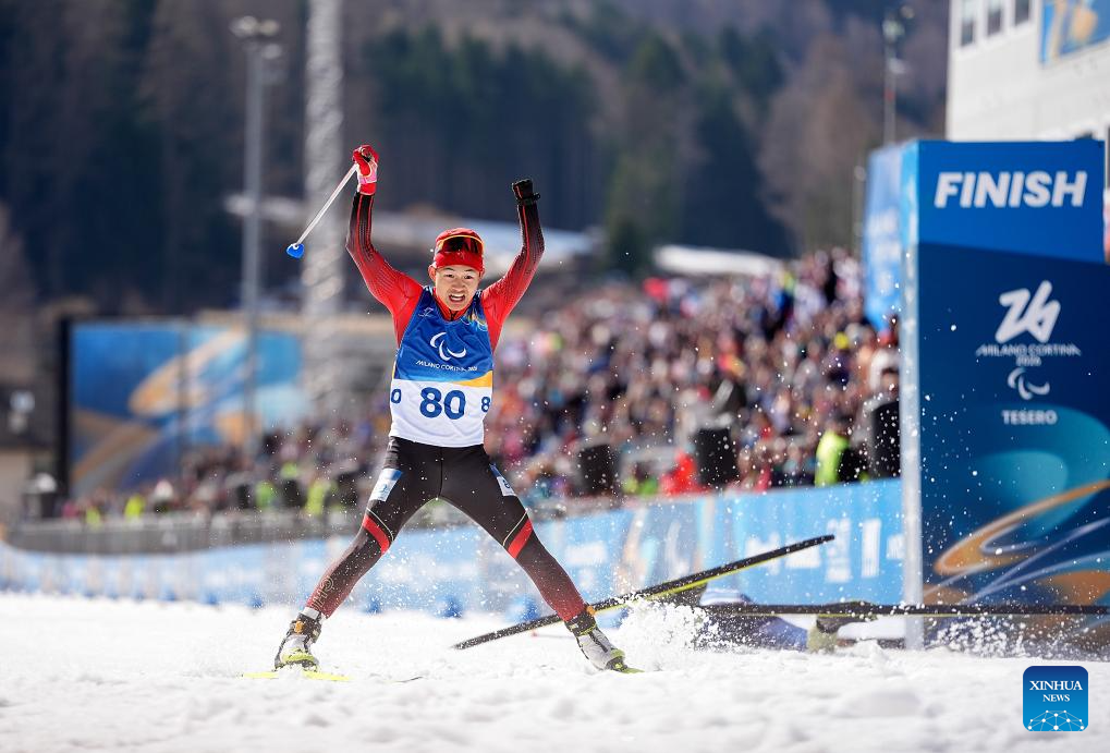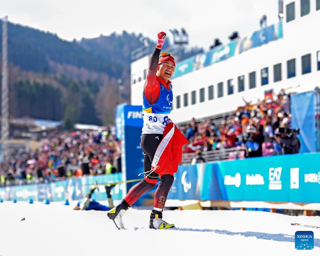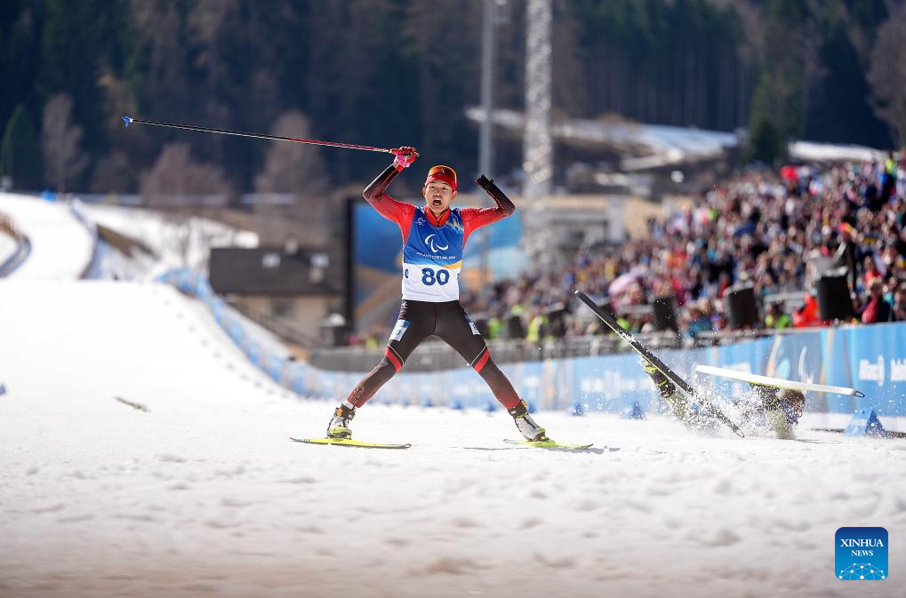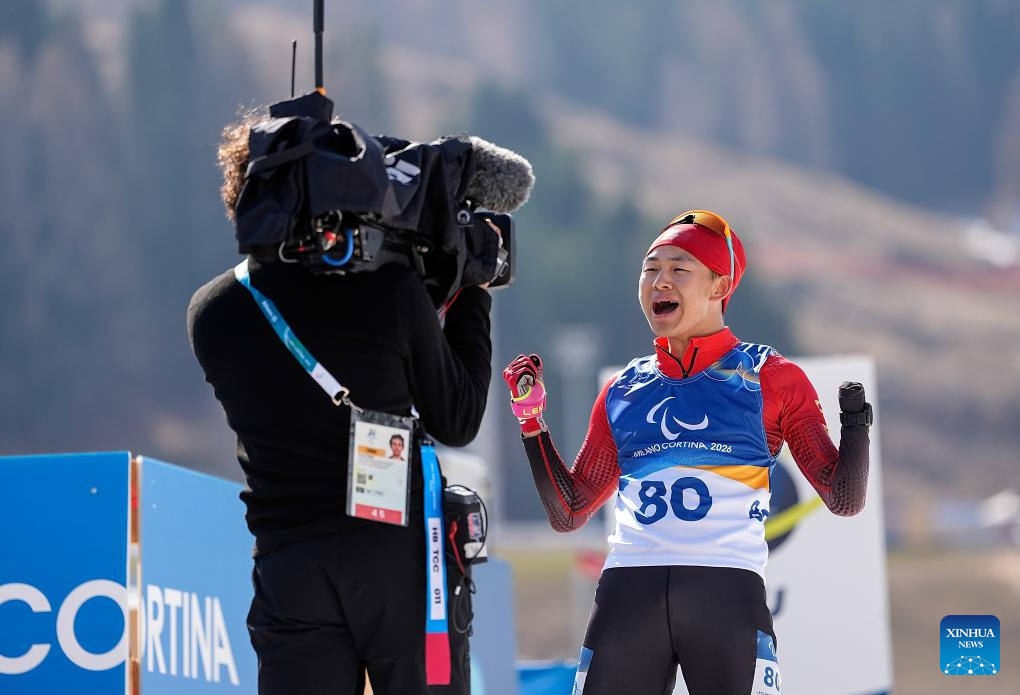 Cai Jiayun of China celebrates after crowning the para biathlon men's sprint pursuit standing at the Milan-Cortina 2026 Paralympic Winter Games in Tesero, Italy, March 13, 2026. (Xinhua/Hou Zhaokang)