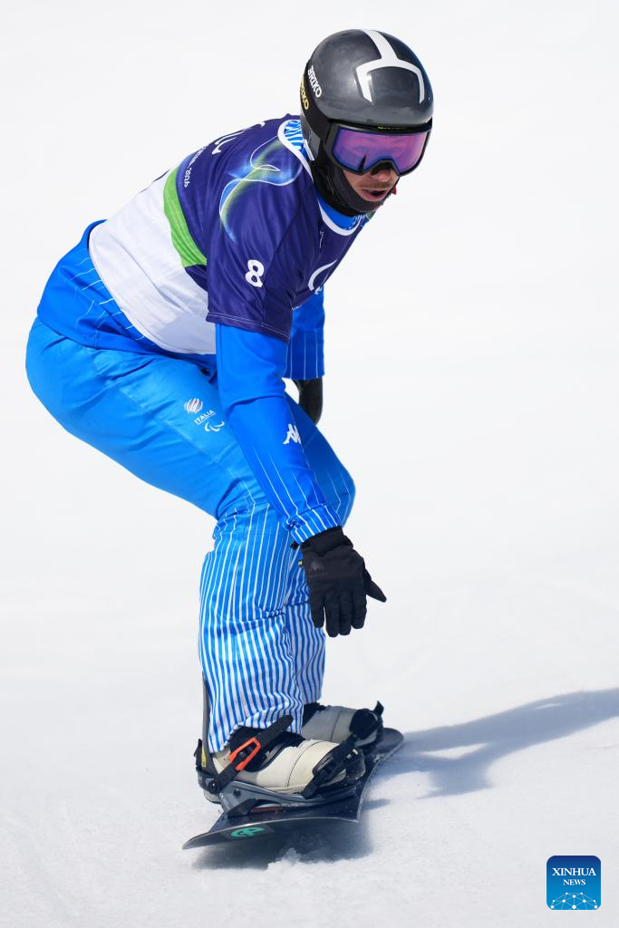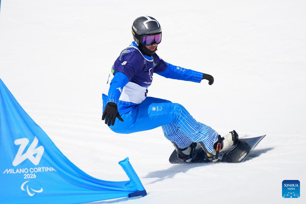 Jacopo Luchini of Italy competes during the Para Snowboard Men's Banked Slalom SB-UL event at the Milan-Cortina 2026 Paralympic Winter Games in Cortina D'ampezzo, Italy, March 13, 2026. (Xinhua/Lian Yi)