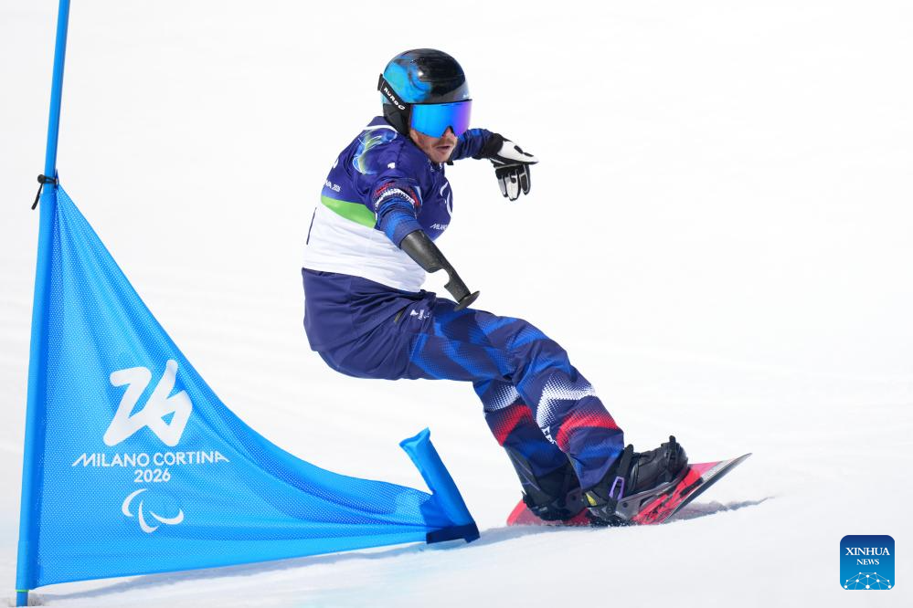 Maxime Montagggioni of France competes during the Para Snowboard Men's Banked Slalom SB-UL event at the Milan-Cortina 2026 Paralympic Winter Games in Cortina D'ampezzo, Italy, March 13, 2026. (Xinhua/Lian Yi)