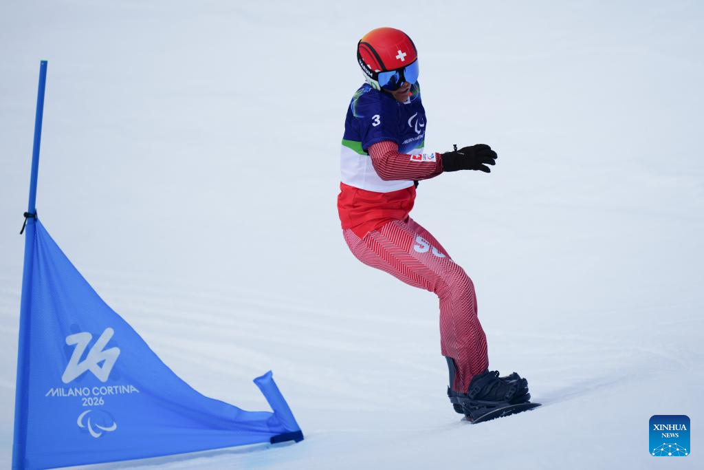 Aron Fahrni of Switzerland competes during the Para Snowboard Men's Banked Slalom SB-UL event at the Milan-Cortina 2026 Paralympic Winter Games in Cortina D'ampezzo, Italy, March 13, 2026. (Xinhua/Lian Yi)