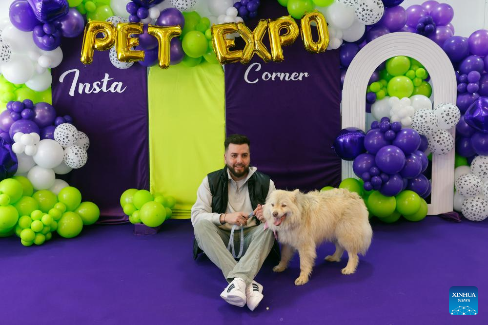 A participant poses with his dog during PetExpo Romania 2026 in Bucharest, Romania, on March 14, 2026. (Photo by Cristian Cristel/Xinhua)