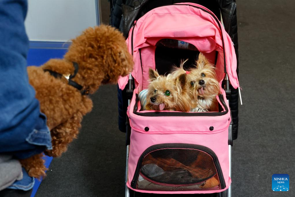 Two Yorkshire terriers are seen in a stroller during PetExpo Romania 2026 in Bucharest, Romania, on March 14, 2026. (Photo by Cristian Cristel/Xinhua)
