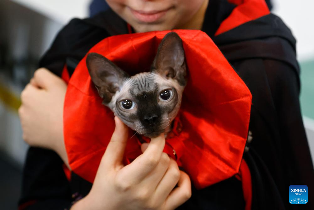 A participant interacts with a Sphynx cat during PetExpo Romania 2026 in Bucharest, Romania, on March 14, 2026. (Photo by Cristian Cristel/Xinhua)