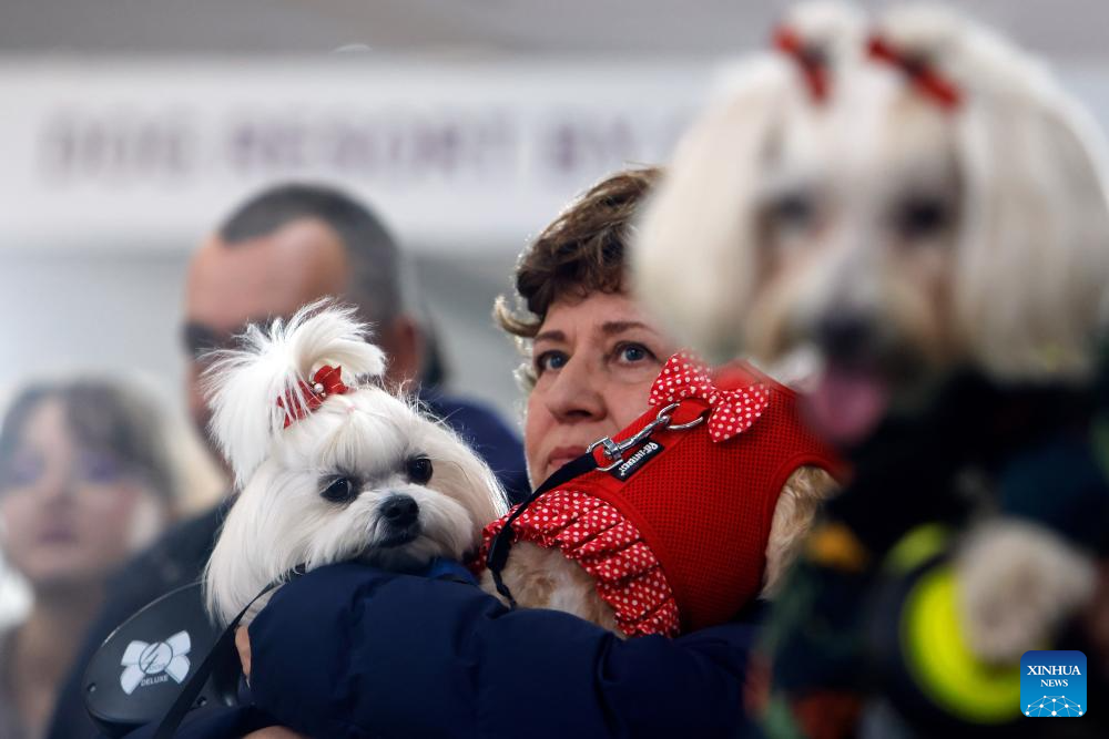A participant holds a Maltese dog during PetExpo Romania 2026 in Bucharest, Romania, on March 14, 2026. (Photo by Cristian Cristel/Xinhua)