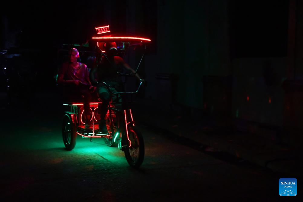 People travel by tricycle during a national blackout in Havana, Cuba, on March 16, 2026. Cuba's national power grid suffered a total blackout on Monday, and the process of restoring electricity is currently underway, according to the Electric Union of Cuba. (Photo by Joaquin Hernandez/Xinhua)