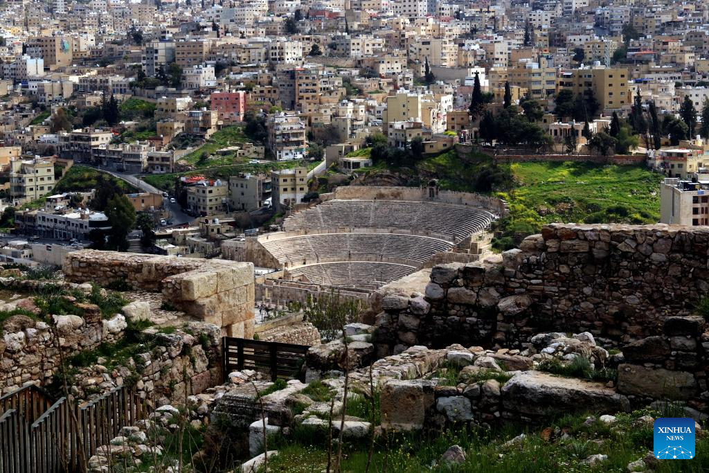This photo taken on March 16, 2026 shows a view of the historical Roman Theater in Amman, Jordan. (Photo by Mohammad Abu Ghosh/Xinhua)