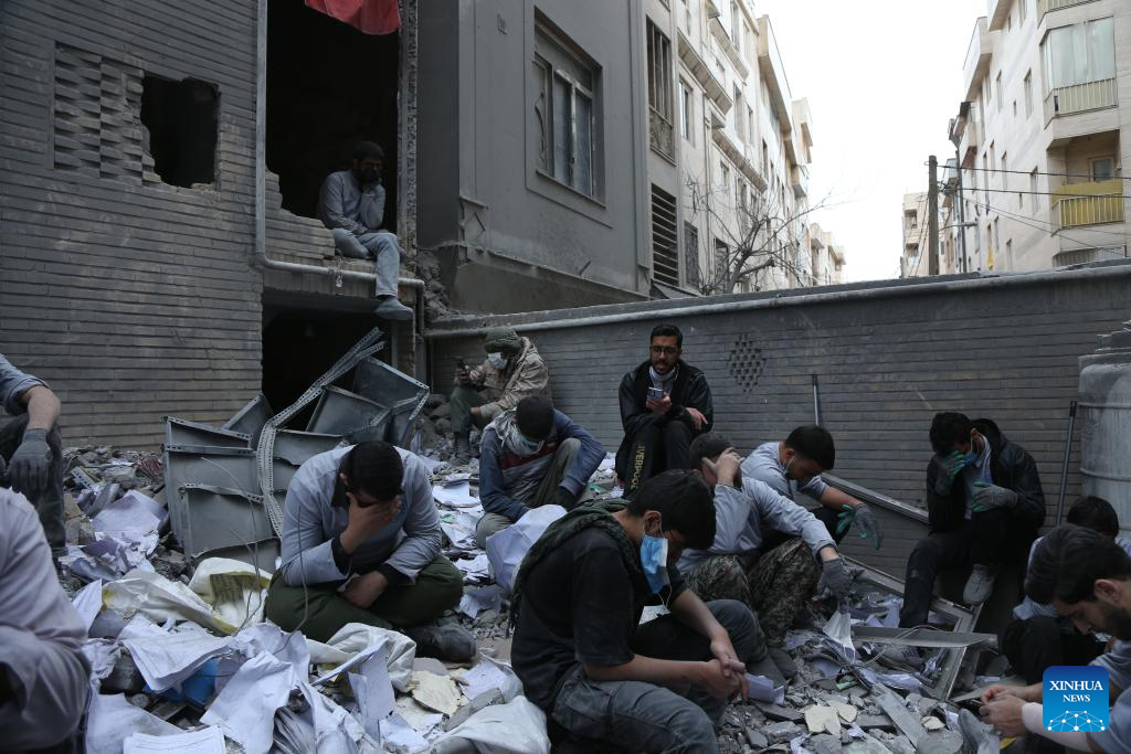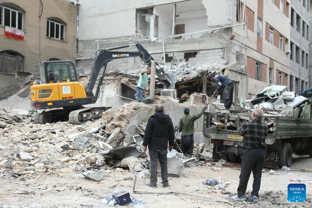 People clear the debris among destroyed buildings at a residential area in Tehran, Iran, March 15, 2026. (Xinhua/Shadati)