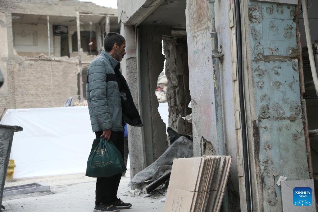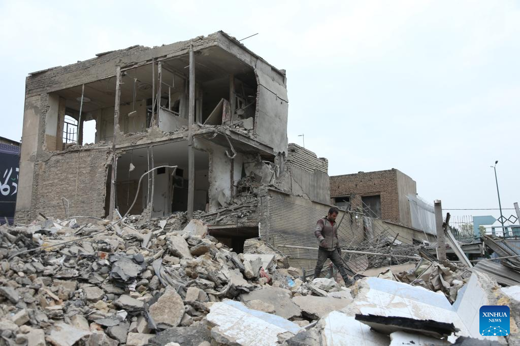 A man stands in front of a destroyed building at a residential area in Tehran, Iran, March 15, 2026. (Xinhua/Shadati)