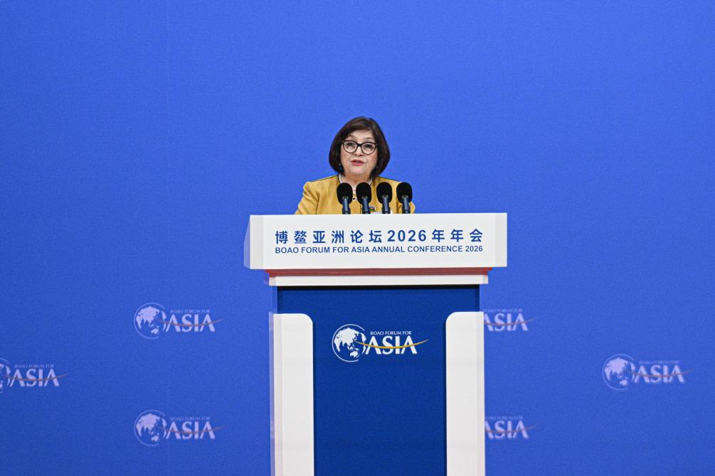 Sahiba Gafarova, speaker of the Milli Majlis of Azerbaijan, delivers a speech at a plenary during the Boao Forum for Asia (BFA) Annual Conference 2026 in Boao, south China's Hainan Province, March 26, 2026. (Xinhua/Pu Xiaoxu)