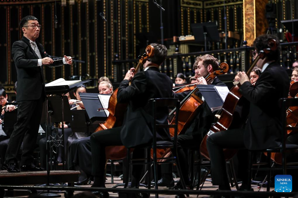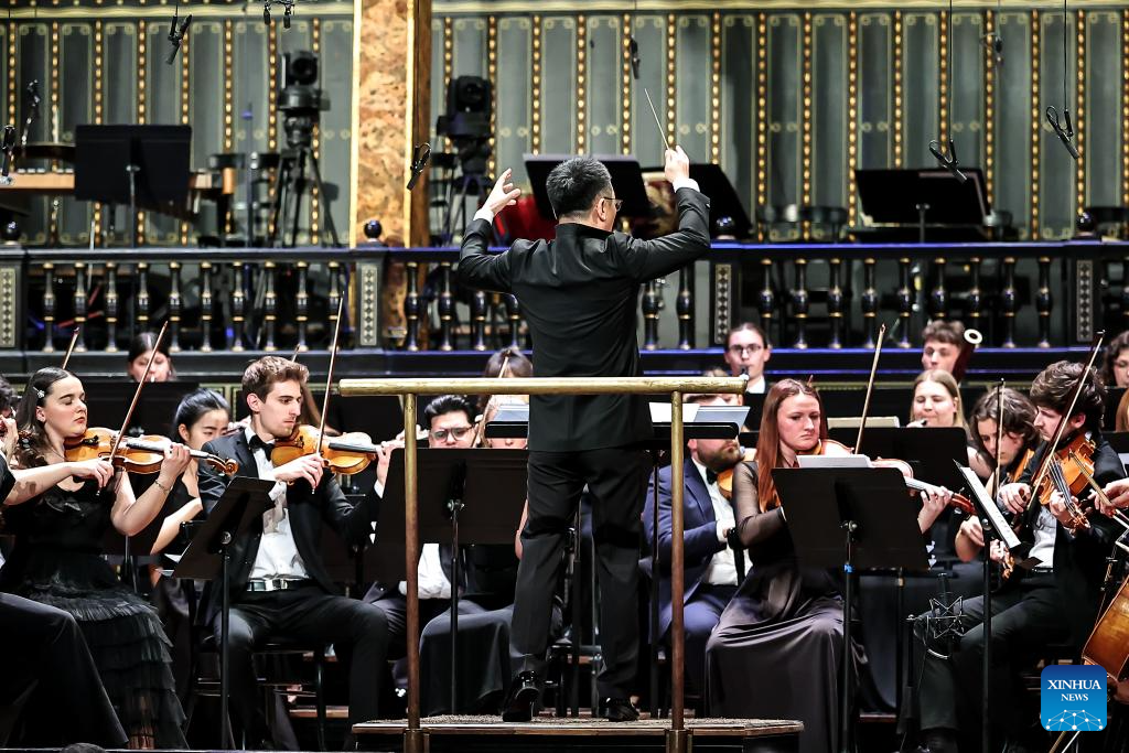 Li Xincao, president of China Conservatory of Music, conducts a China-Hungary cultural exchange concert in Budapest, Hungary, March 25, 2026. The concert, titled "TUTTI -- China-Hungary Cultural Exchange Concert," was held on Wednesday evening at the Liszt Academy of Music in Budapest, featuring a joint symphony orchestra of young musicians from the two countries. (Photo by David Balogh/Xinhua)