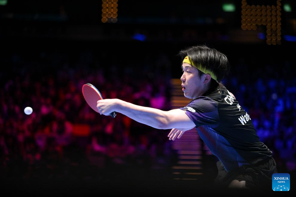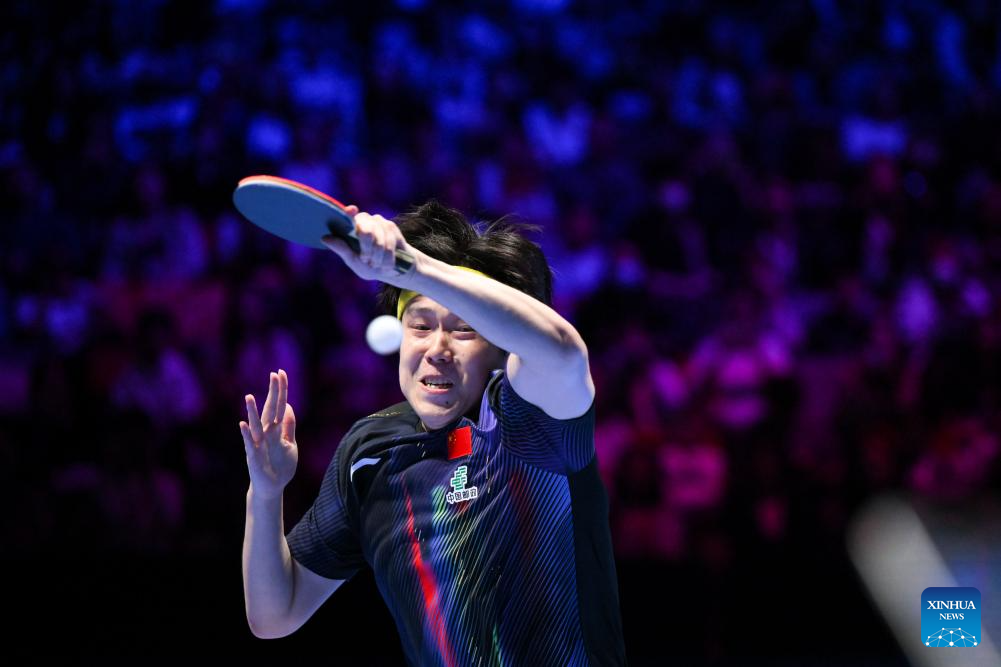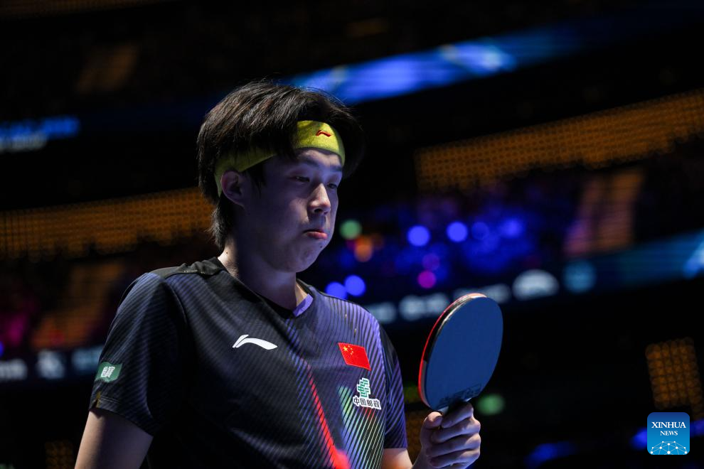 Wang Chuqin hits a return during the men's singles round of 16 match between Wang Chuqin of China and Felix Lebrun of France at the ITTF Men's and Women's World Cup 2026 in Macao, China, April 3, 2026. (Xinhua/Cheong Kam Ka)