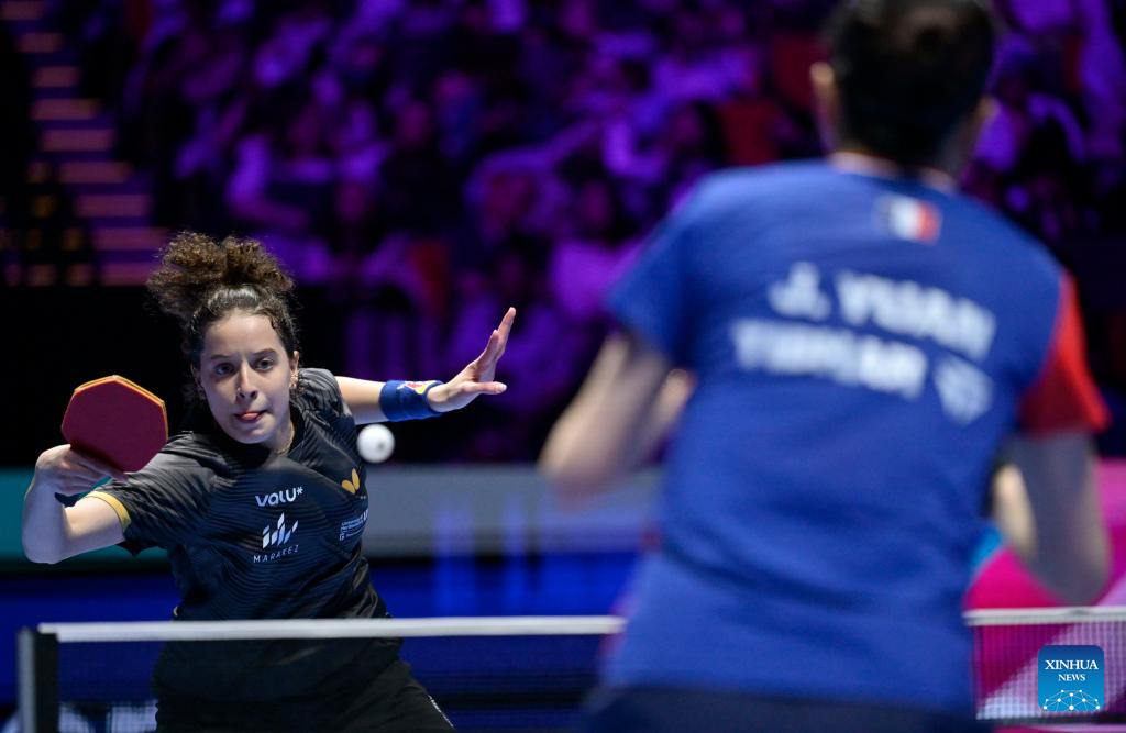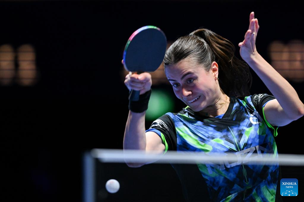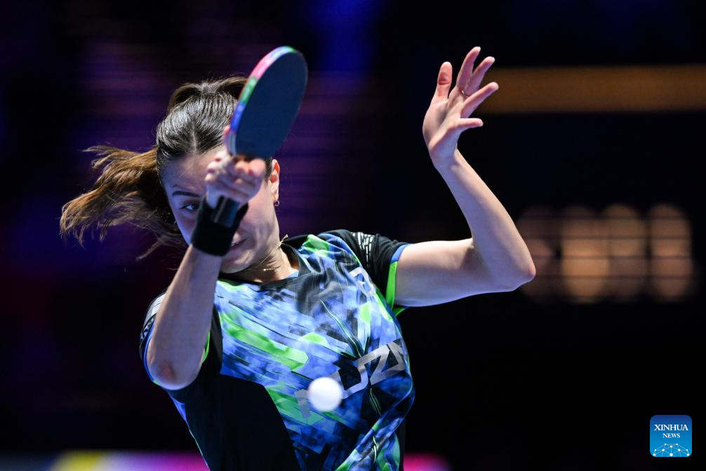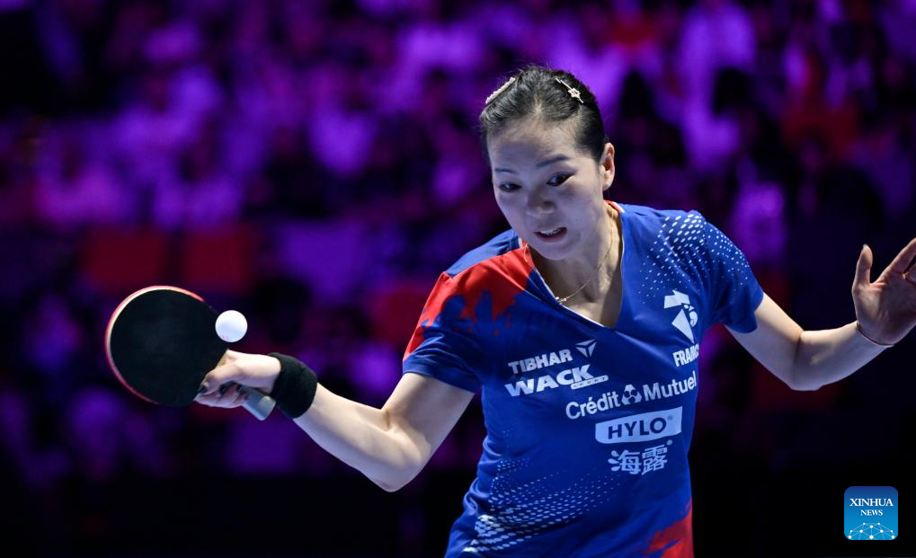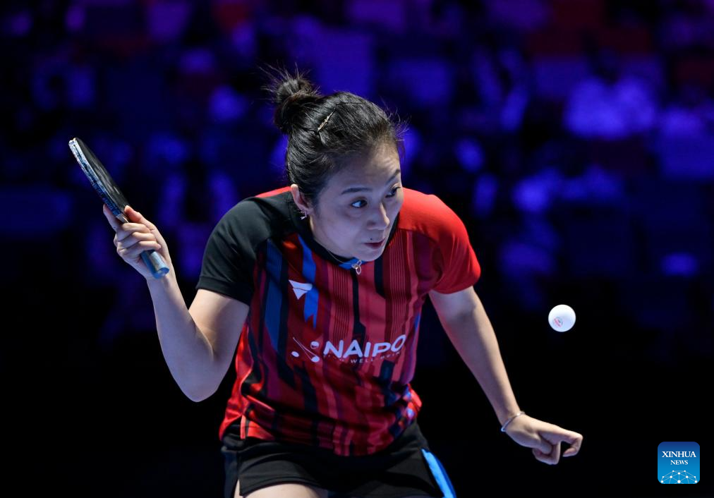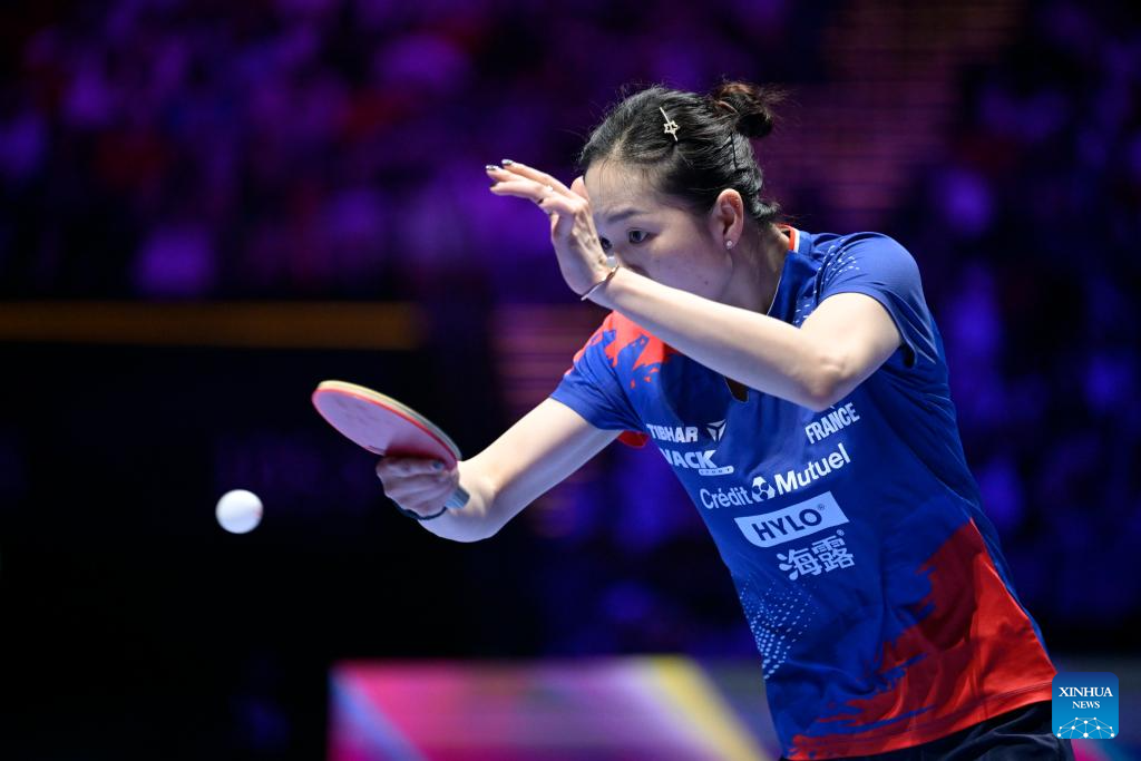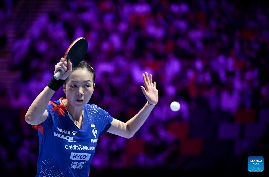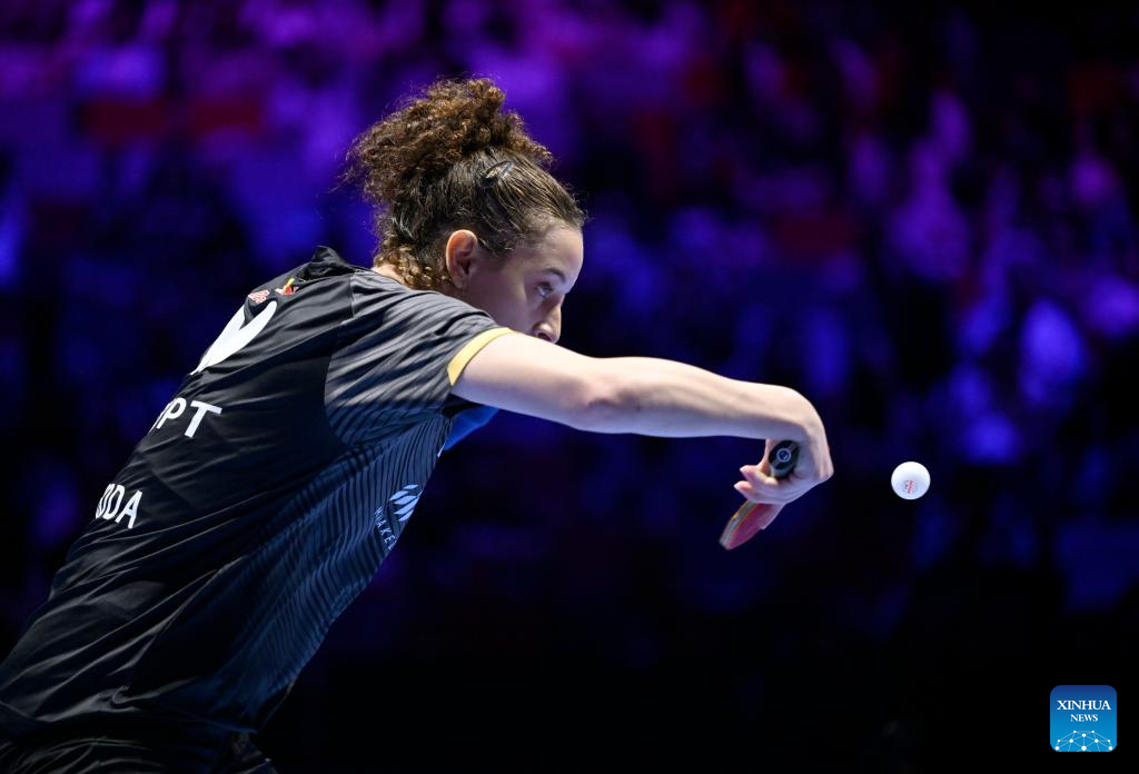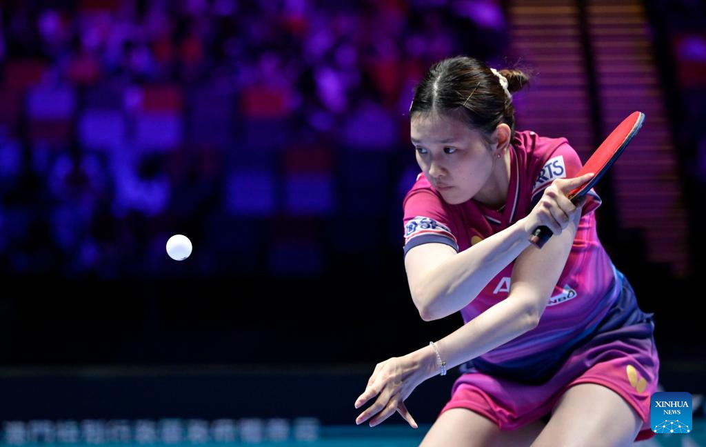 Yuan Jia Nan hits a return during the women's singles round of 16 match between Hana Goda of Egypt and Yuan Jia Nan of France at the ITTF Men's and Women's World Cup 2026 in Macao, China, April 3, 2026. (Xinhua/Yu Yang)