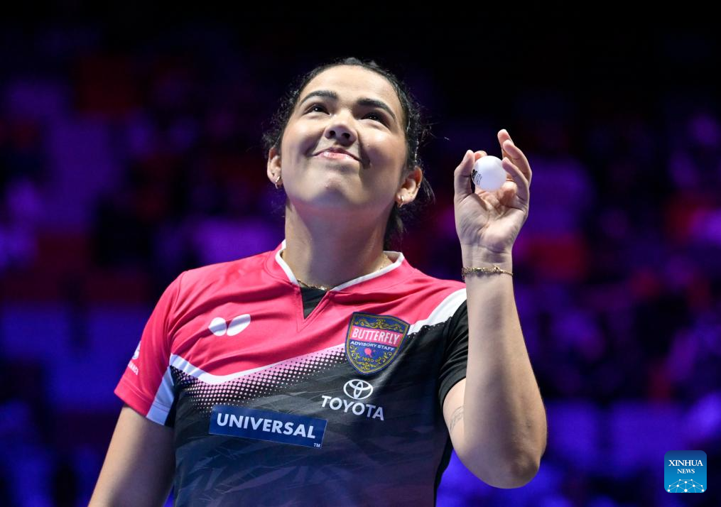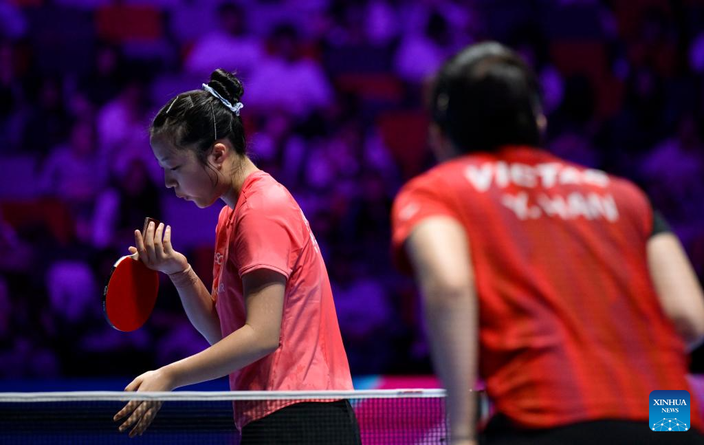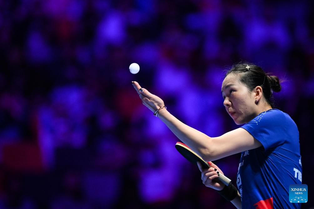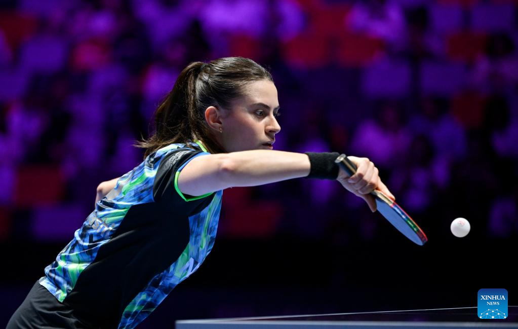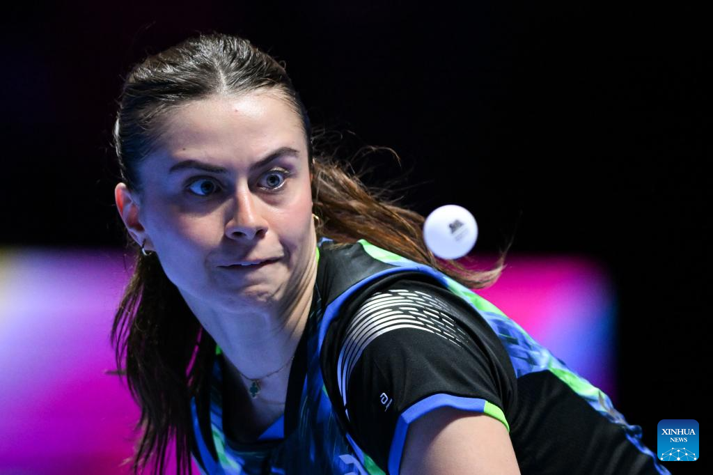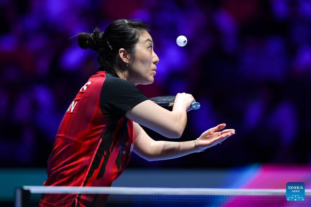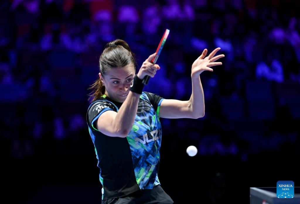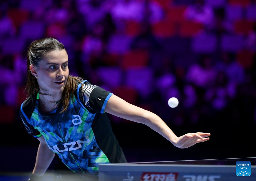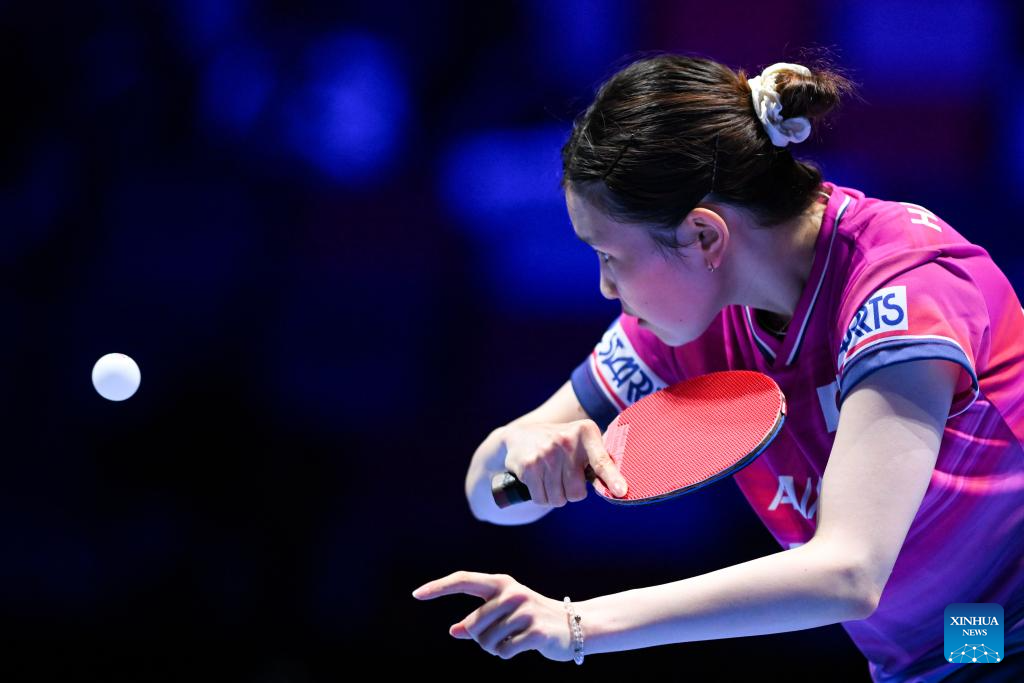 Yuan Jia Nan hits a return during the women's singles round of 16 match between Hana Goda of Egypt and Yuan Jia Nan of France at the ITTF Men's and Women's World Cup 2026 in Macao, China, April 3, 2026. (Xinhua/Yu Yang)