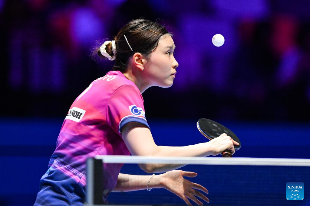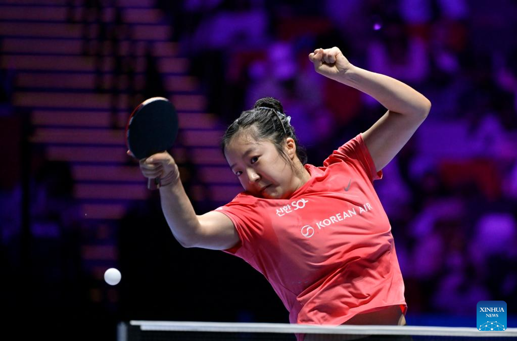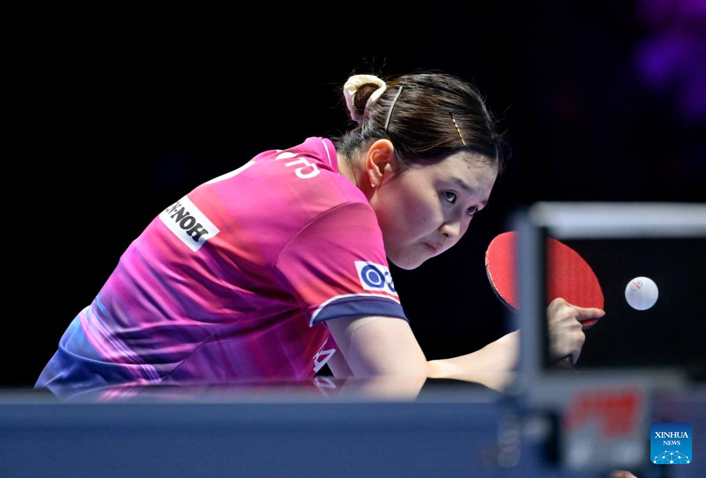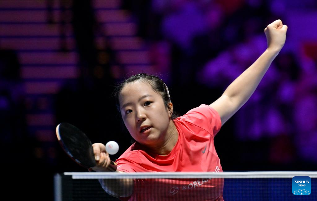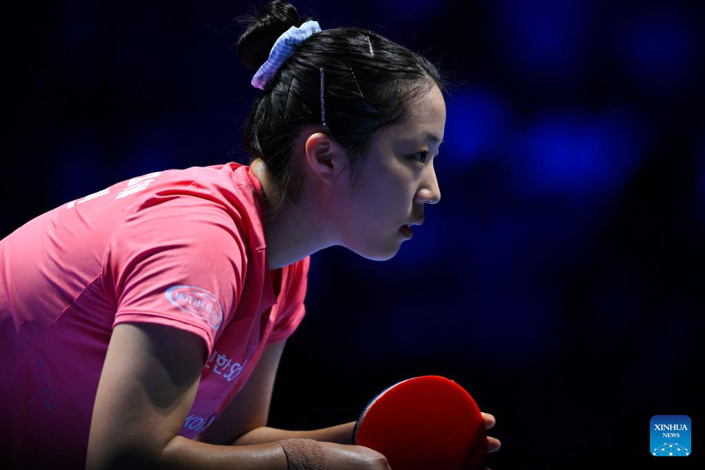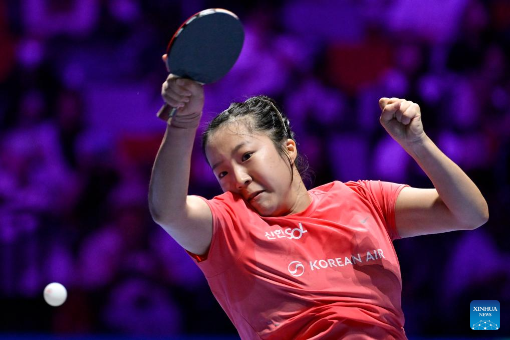 Shin Yubin hits a return during the women's singles round of 16 match between Han Ying of Germany and Shin Yubin of South Korea at the ITTF Men's and Women's World Cup 2026 in Macao, China, April 3, 2026. (Xinhua/Yu Yang)