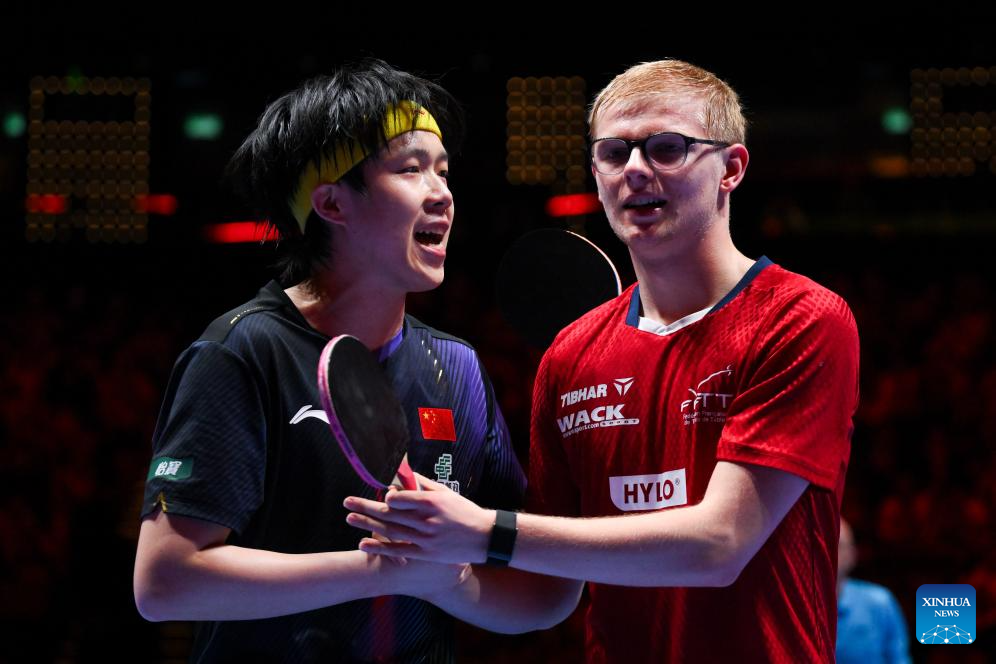 Wang Chuqin (L) greets Felix Lebrun after the men's singles round of 16 match between Wang Chuqin of China and Felix Lebrun of France at the ITTF Men's and Women's World Cup 2026 in Macao, China, April 3, 2026. (Xinhua/Cheong Kam Ka)