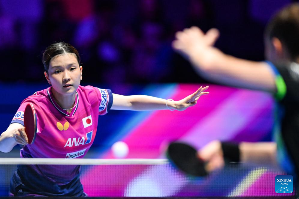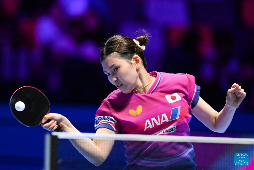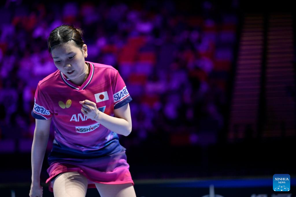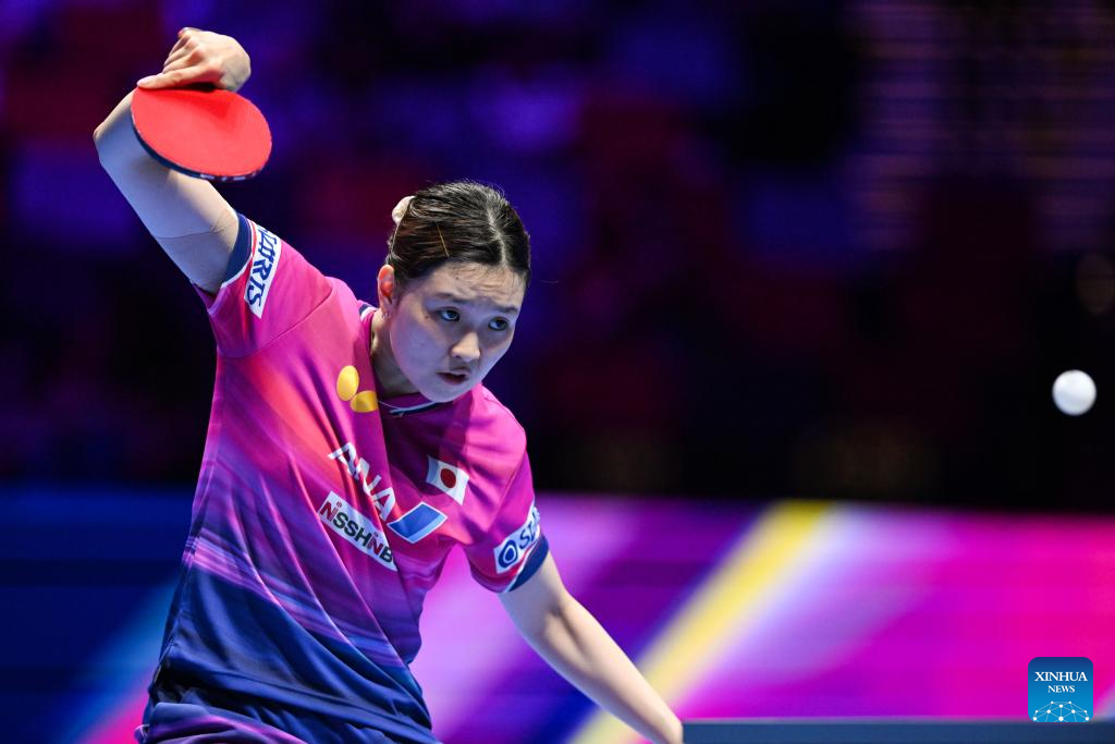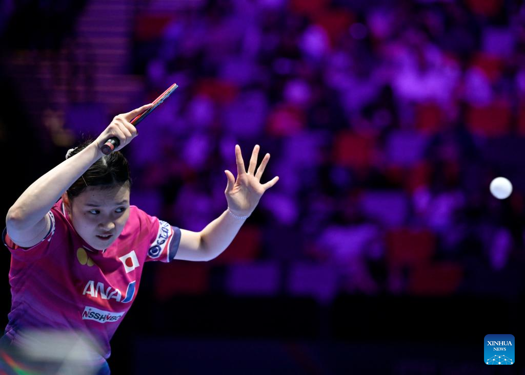 Hashimoto Honoka competes during the women's singles round of 16 match between Bruna Takahashi of Brazil and Hashimoto Honoka of Japan at the ITTF Men's and Women's World Cup 2026 in Macao, China, April 3, 2026. (Xinhua/Cheong Kam Ka)