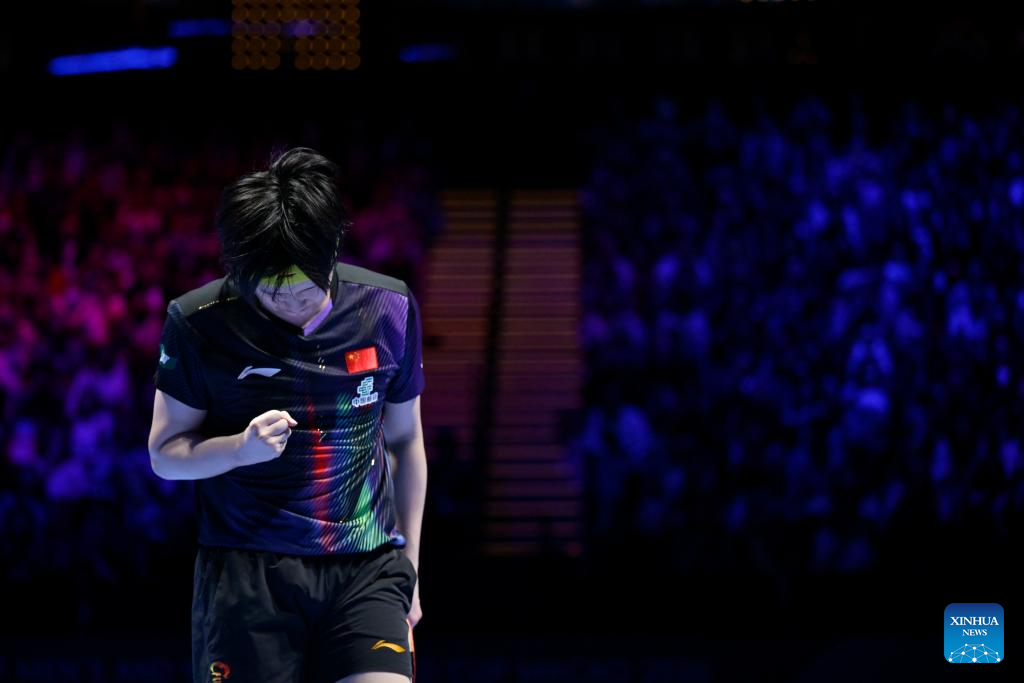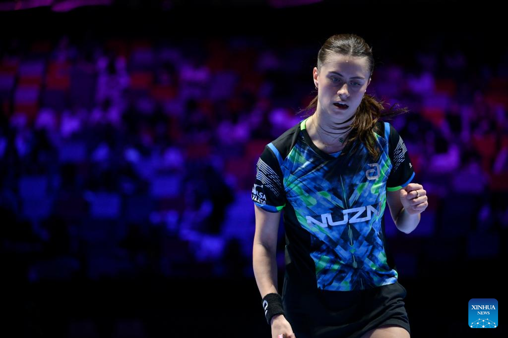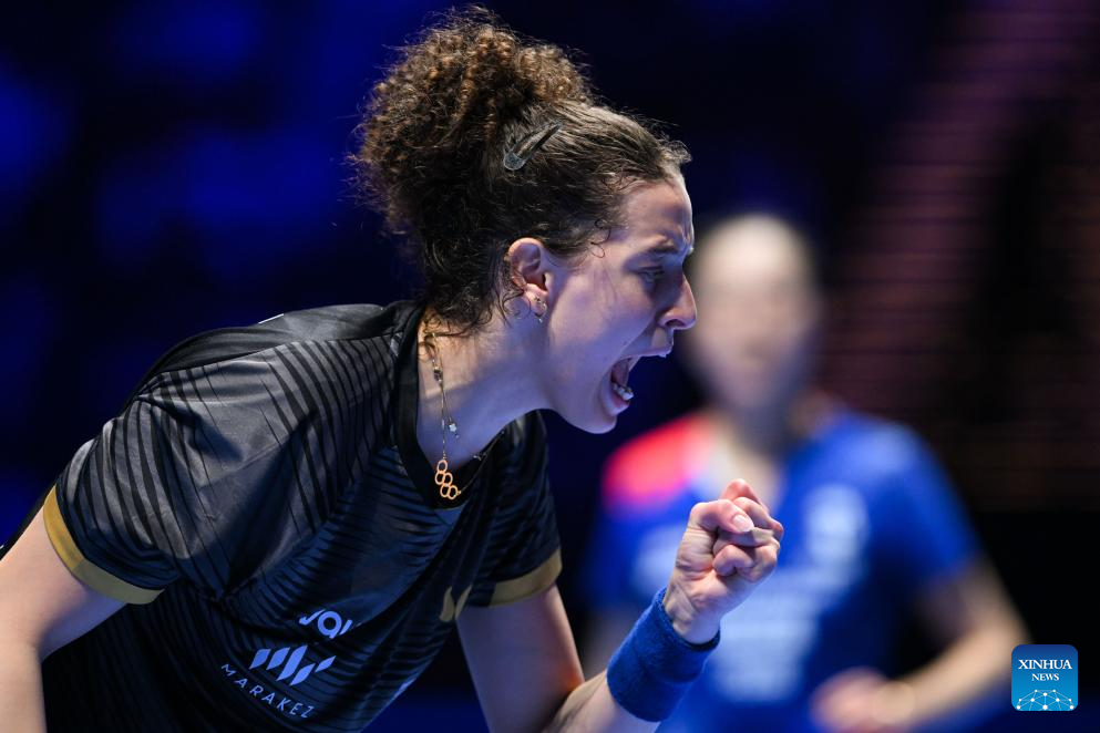Hana Goda celebrates during the women's singles round of 16 match between Hana Goda of Egypt and Yuan Jia Nan of France at the ITTF Men's and Women's World Cup 2026 in Macao, China, April 3, 2026. (Xinhua/Yu Yang)