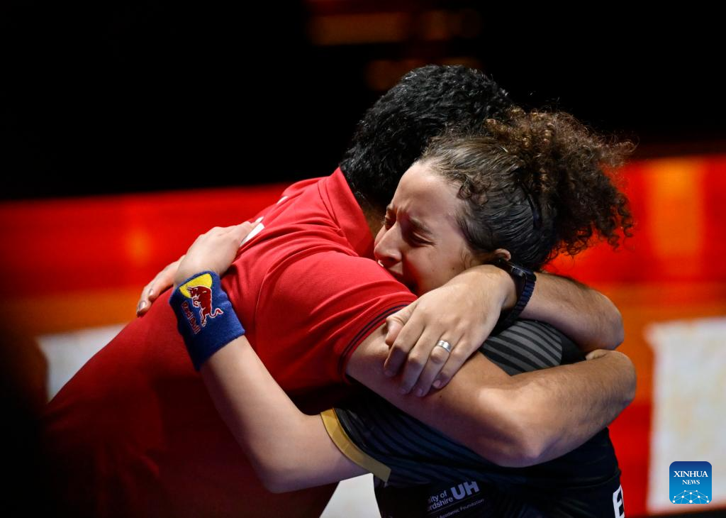 Hana Goda (R) celebrates with her coach after the women's singles round of 16 match between Hana Goda of Egypt and Yuan Jia Nan of France at the ITTF Men's and Women's World Cup 2026 in Macao, China, April 3, 2026. (Xinhua/Yu Yang)