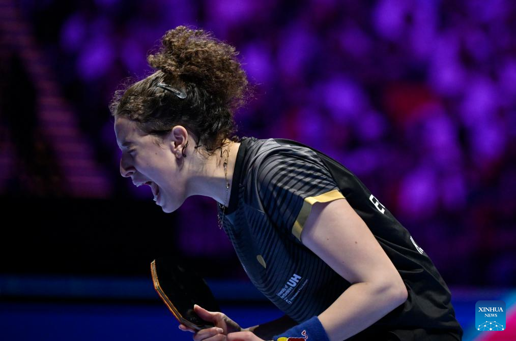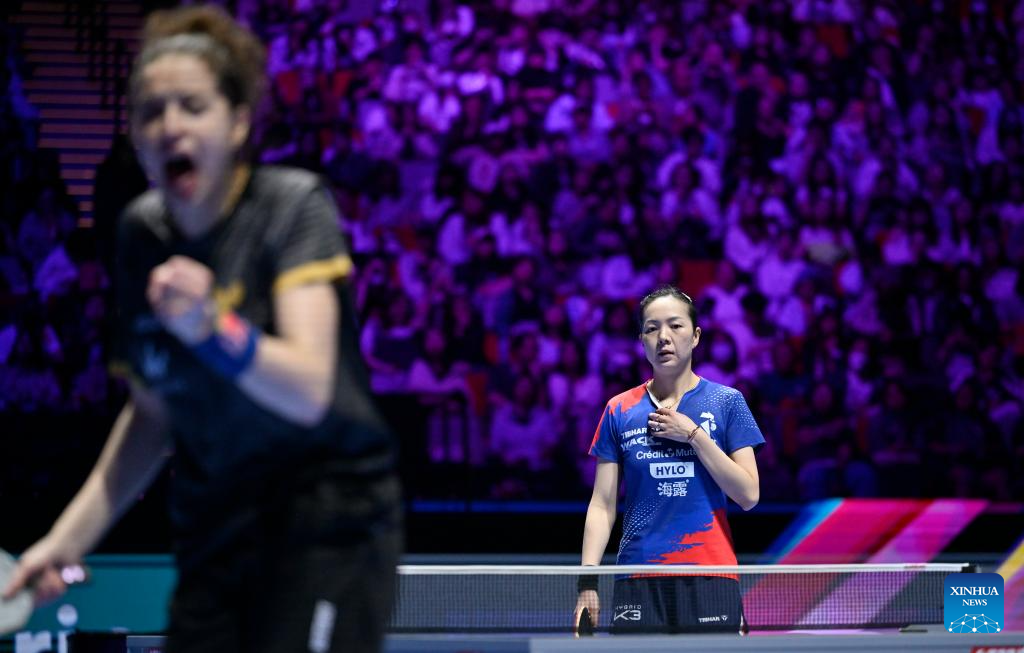 Han Ying hits a return during the women's singles round of 16 match between Han Ying of Germany and Shin Yubin of South Korea at the ITTF Men's and Women's World Cup 2026 in Macao, China, April 3, 2026. (Xinhua/Yu Yang)