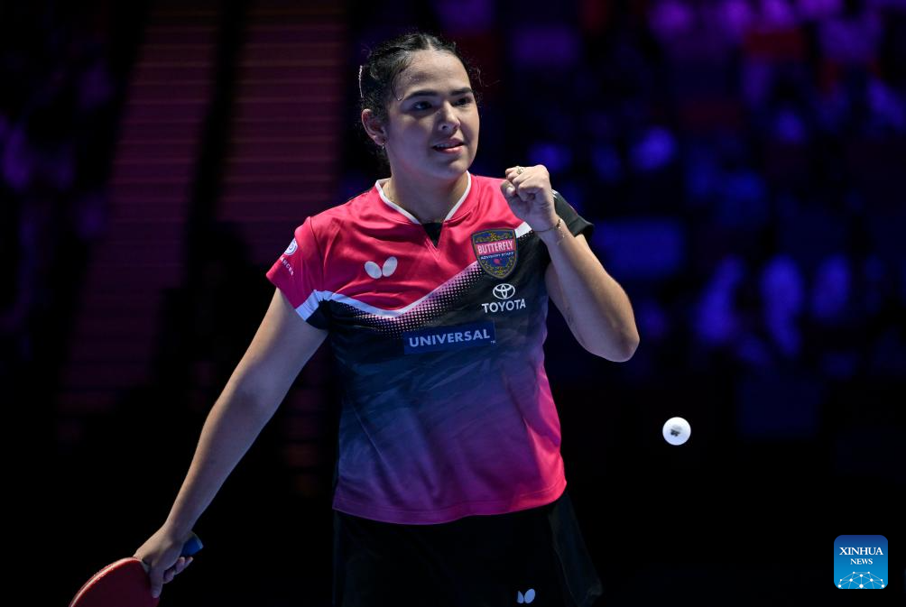Adriana Diaz celebrates scoring during the women's singles round of 16 match between Adriana Diaz of Puerto Rico and Chen Xingtong of China at the ITTF Men's and Women's World Cup 2026 in Macao, China, April 3, 2026. (Xinhua/Yu Yang)