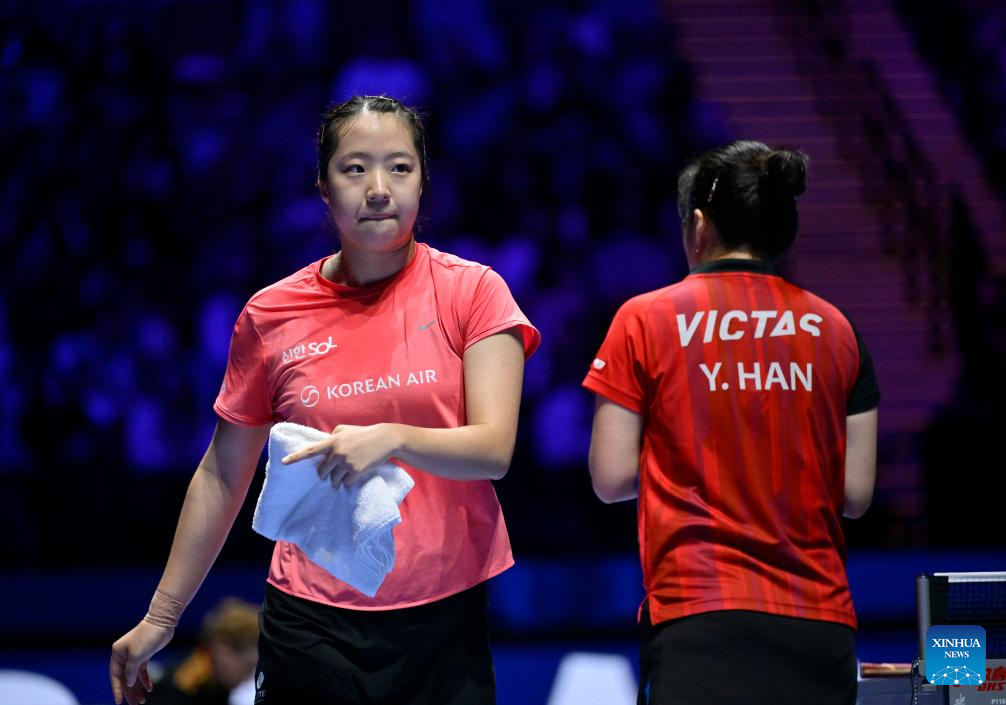 Shin Yubin (L) reacts during the women's singles round of 16 match between Han Ying of Germany and Shin Yubin of South Korea at the ITTF Men's and Women's World Cup 2026 in Macao, China, April 3, 2026. (Xinhua/Yu Yang)