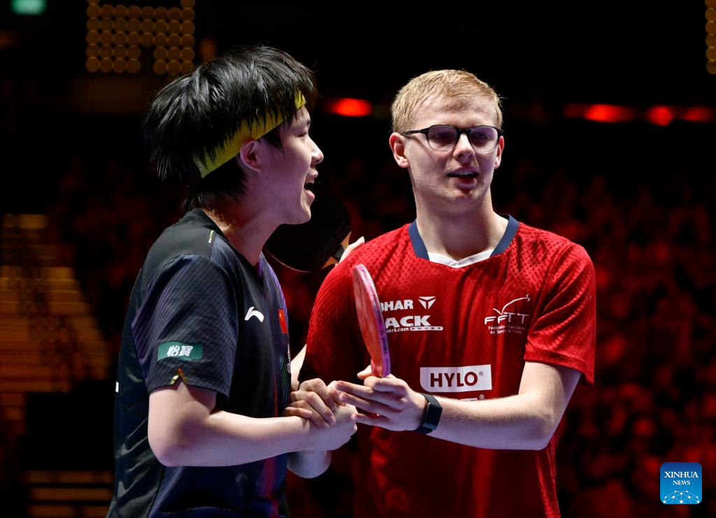 Wang Chuqin (L) greets Felix Lebrun after the men's singles round of 16 match between Wang Chuqin of China and Felix Lebrun of France at the ITTF Men's and Women's World Cup 2026 in Macao, China, April 3, 2026. (Xinhua/Yu Yang)