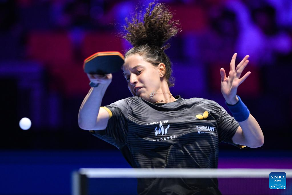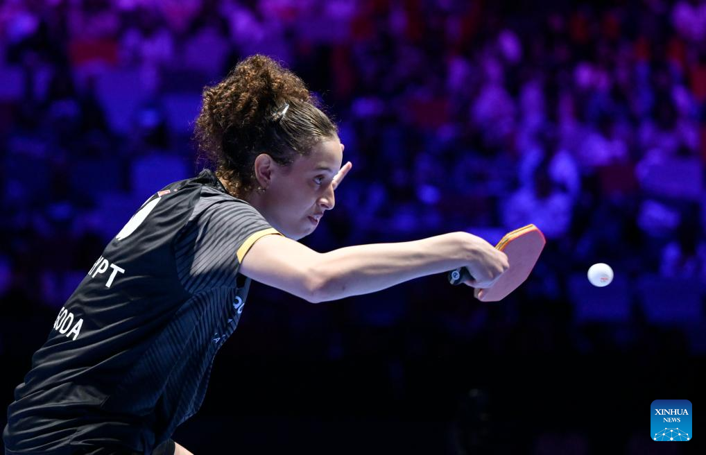 Hana Goda hits a return during the women's singles round of 16 match between Hana Goda of Egypt and Yuan Jia Nan of France at the ITTF Men's and Women's World Cup 2026 in Macao, China, April 3, 2026. (Xinhua/Yu Yang)