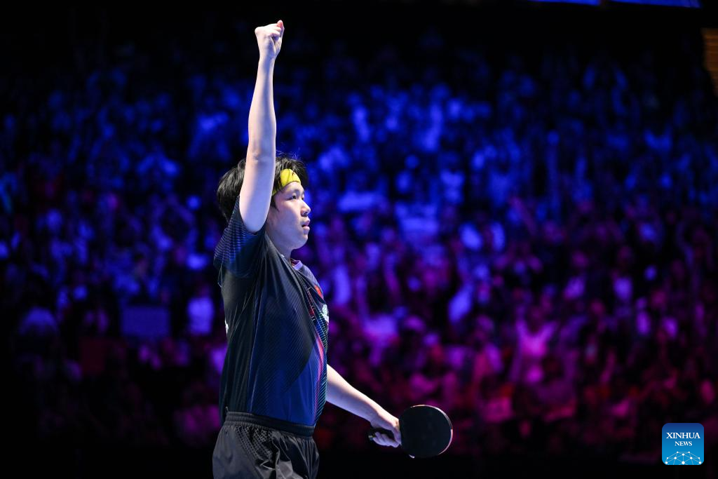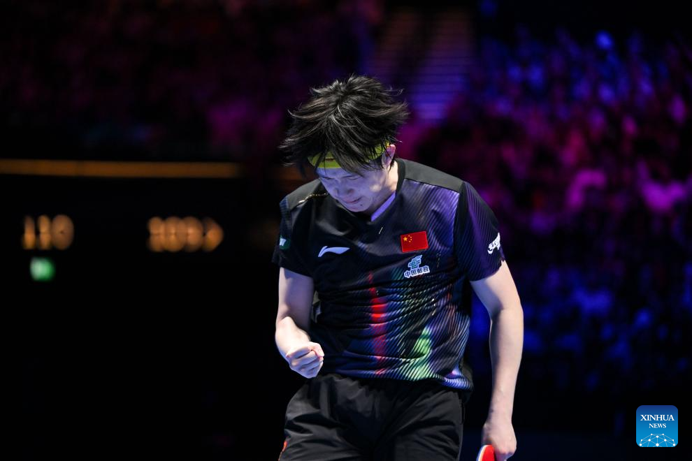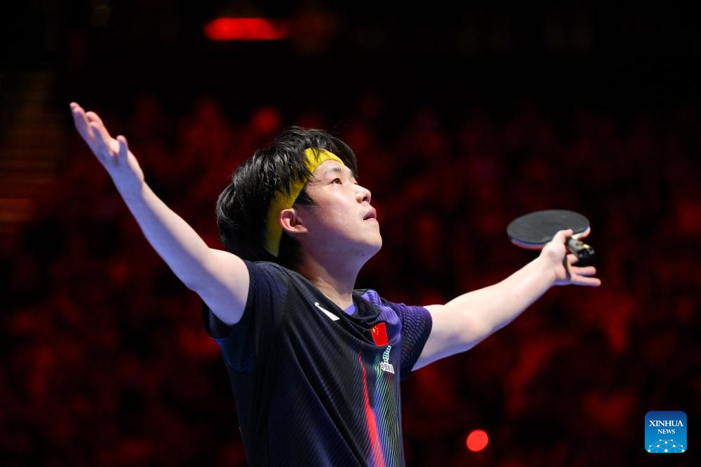 Wang Chuqin celebrates after the men's singles round of 16 match between Wang Chuqin of China and Felix Lebrun of France at the ITTF Men's and Women's World Cup 2026 in Macao, China, April 3, 2026. (Xinhua/Cheong Kam Ka)