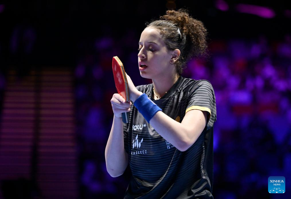 Hana Goda reacts during the women's singles round of 16 match between Hana Goda of Egypt and Yuan Jia Nan of France at the ITTF Men's and Women's World Cup 2026 in Macao, China, April 3, 2026. (Xinhua/Yu Yang)