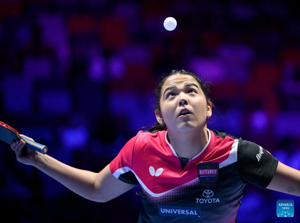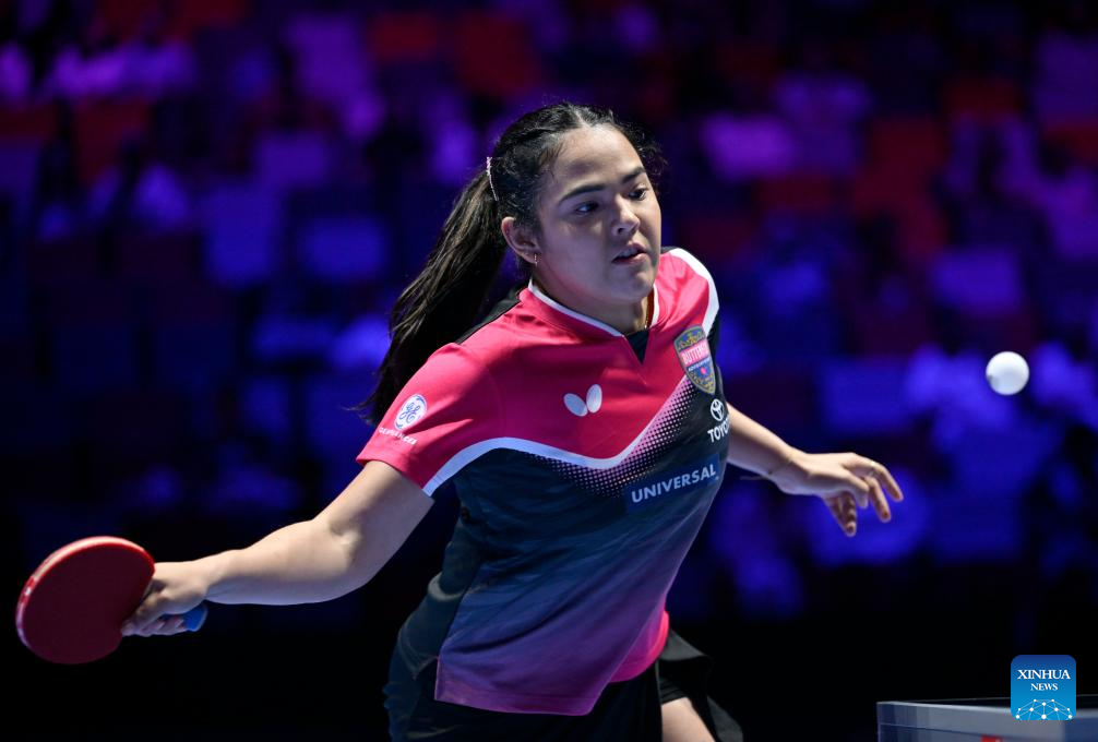 Adriana Diaz hits a return during the women's singles round of 16 match between Adriana Diaz of Puerto Rico and Chen Xingtong of China at the ITTF Men's and Women's World Cup 2026 in Macao, China, April 3, 2026. (Xinhua/Yu Yang)
