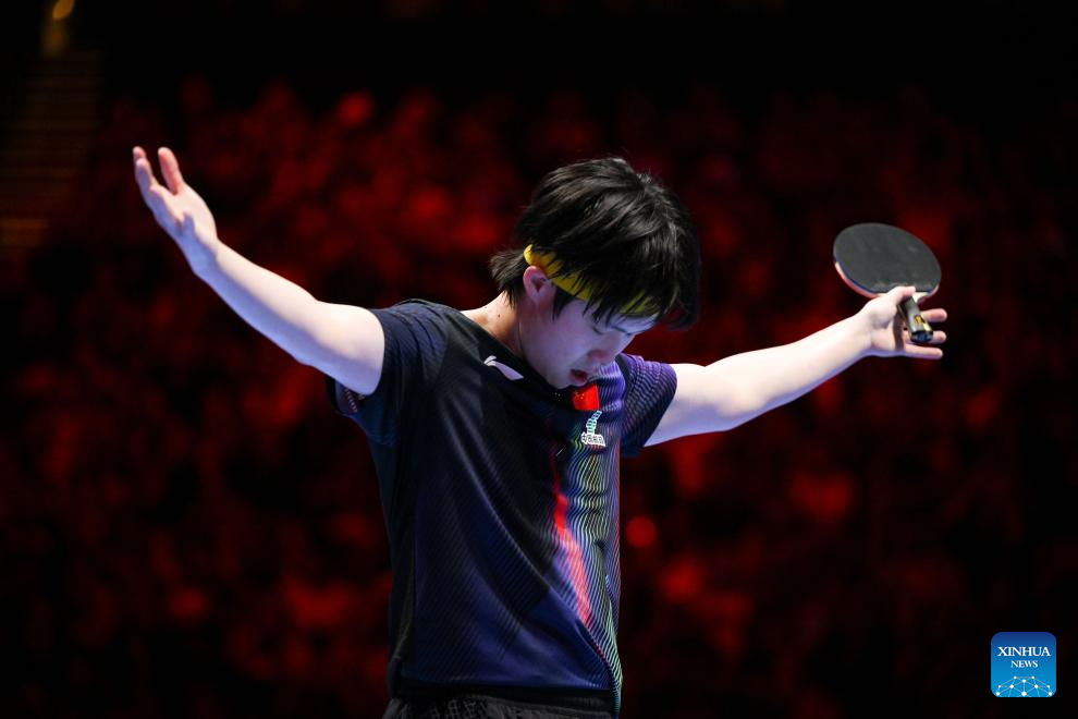 Wang Chuqin celebrates during the men's singles round of 16 match between Wang Chuqin of China and Felix Lebrun of France at the ITTF Men's and Women's World Cup 2026 in Macao, China, April 3, 2026. (Xinhua/Cheong Kam Ka)