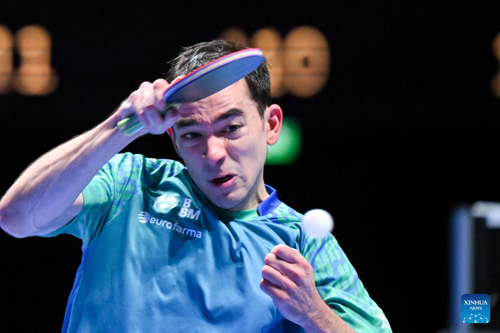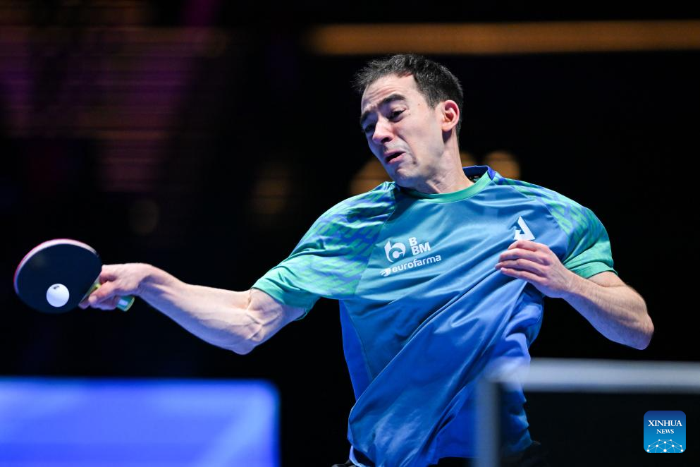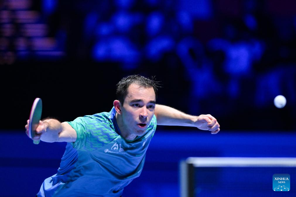 Hugo Calderano competes during the men's singles round of 16 match between Hugo Calderano of Brazil and Togami Shunsuke of Japan at the ITTF Men's and Women's World Cup 2026 in Macao, China, April 3, 2026. (Xinhua/Cheong Kam Ka)