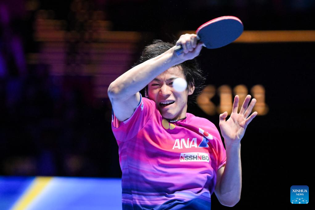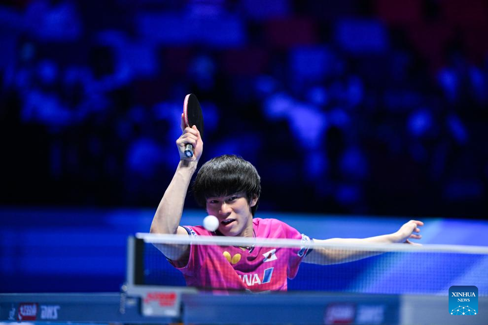Togami Shunsuke competes during the men's singles round of 16 match between Hugo Calderano of Brazil and Togami Shunsuke of Japan at the ITTF Men's and Women's World Cup 2026 in Macao, China, April 3, 2026. (Xinhua/Cheong Kam Ka)