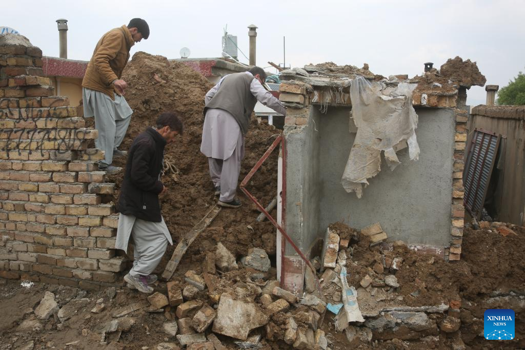 People check damage after a house has collapsed during heavy rains in Kabul, capital of Afghanistan, April 5, 2026. The death toll from heavy rainfall-triggered flooding across Afghanistan has risen to at least 99 people, with 154 others injured over the past nine days, a spokesman for the National Disaster Management Authority said on Sunday. (Photo by Saifurahman Safi/Xinhua)