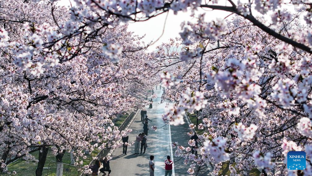 An aerial drone photo taken on April 2, 2026 shows tourists enjoying cherry blossoms in Yangzhou, east China's Jiangsu Province. Qingming Festival, or Tomb-Sweeping Day, falls on April 5 this year. It is a traditional Chinese festival for people to pay tribute to the dead and worship their ancestors. The holiday also provides a short break for Chinese citizens as they engage in outdoor activities and sightseeing. (Photo by Qi Liguang/Xinhua)