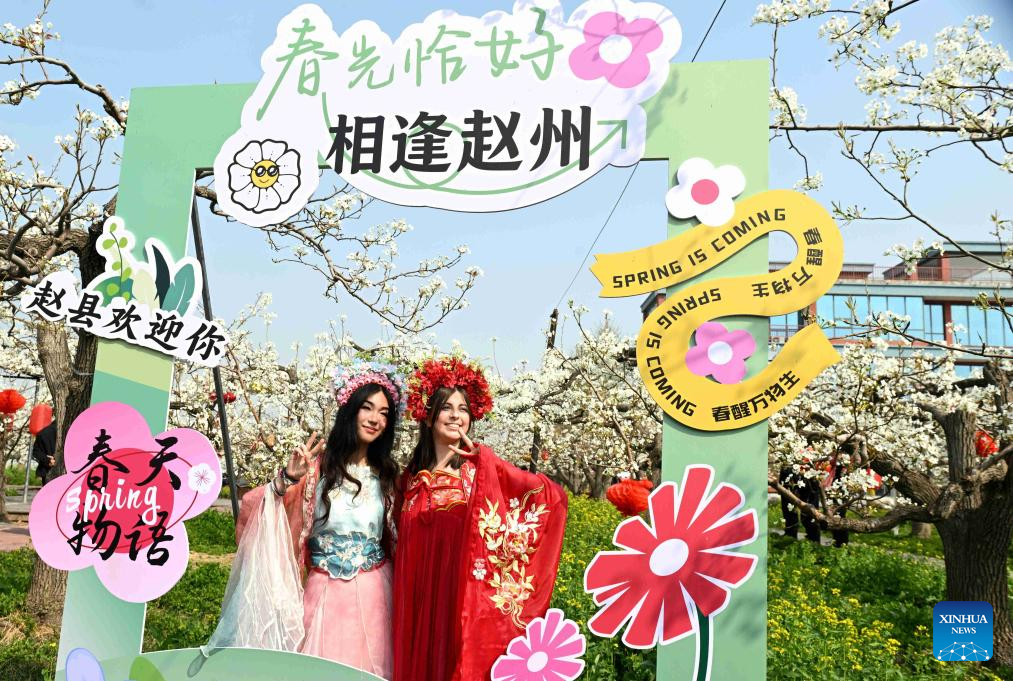 Foreign tourists in traditional Chinese costumes pose for photos at a park in Shijiazhuang, north China's Hebei Province, April 2, 2026. Qingming Festival, or Tomb-Sweeping Day, falls on April 5 this year. It is a traditional Chinese festival for people to pay tribute to the dead and worship their ancestors. The holiday also provides a short break for Chinese citizens as they engage in outdoor activities and sightseeing. (Photo by Chen Qibao/Xinhua)